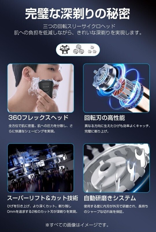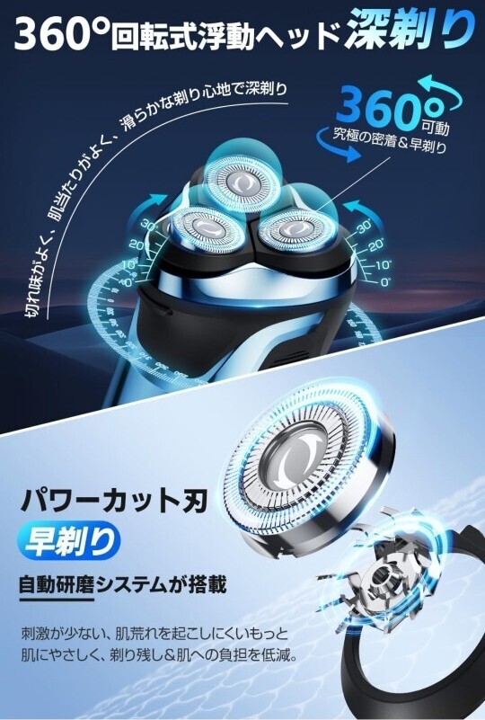 【深剃り・高性能27枚刃&360°フレックスヘッド】肌への優しさと深剃りを同時に実現できる 電気シェーバー は、回転式の高性能27枚刃が、肌にフィットしながらも緻密な剃り心地を提供し、この シェーバー 一つで綺麗に整えることができ、毎日のお手入れが楽しみに変わります。肌の凹凸に完璧にフィットする360°フレックスヘッドを搭載しているため、あごのラインや頬の曲線を逃さず、どんな角度からでも快適な剃りを実現される 電動 髭剃り となり、動きに柔軟に対応するヘッドが、肌に優しく接触しながら、均一な圧力でヒゲを刈り取ります。もう、手が届かない場所や剃り残しに悩むことはありません。
