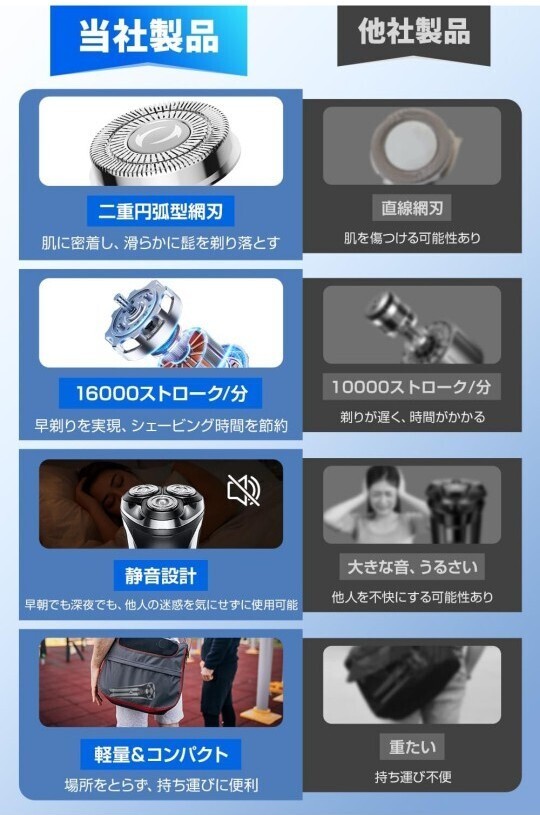 【パワフルなモーター・静音設計】静音設計のモーターはパワフルで、一回のストロークでより多くのヒゲを捕らえ、効率的な剃りを実現する メンズシェーバー は、忙しい朝も、無駄なく、スピーディーに準備を整えられるため、日々のルーティンがより快適に、そして迅速に。朝のひとときは、一日の始まりにふさわしい静けさが求められます。私たちのメンズ 電動 シェーバーは、その穏やかな時間を大切にするために、静音設計にこだわりました。高性能ながらも、家族を起こすことなく、また自分だけの時間を静かに楽しむことができる、そんな静寂を保ちます。周りを気にせずに、あなたに集中したケアを提供します。