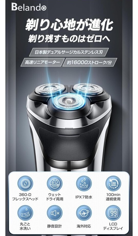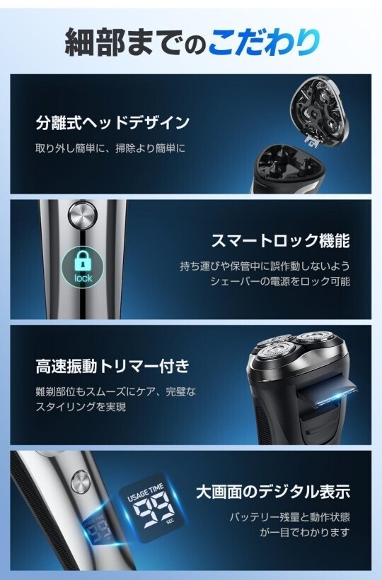 【超大型LCD・状態一目瞭然】私たちの 電気シェーバー は、使いやすさを追求し、超大型LCDディスプレイを搭載しています。これにより、バッテリー残量や充電状態、さらには使用時間やロック状態までもが一目で瞭然。いつでも シェーバー の状態を把握できるため、突然の電池切れに悩まされることもありません。ユーザーの使い心地を第一に考えた、この直感的な表示機能が、忙しい朝の準備をよりスムーズに進める手助けとなるでしょう。