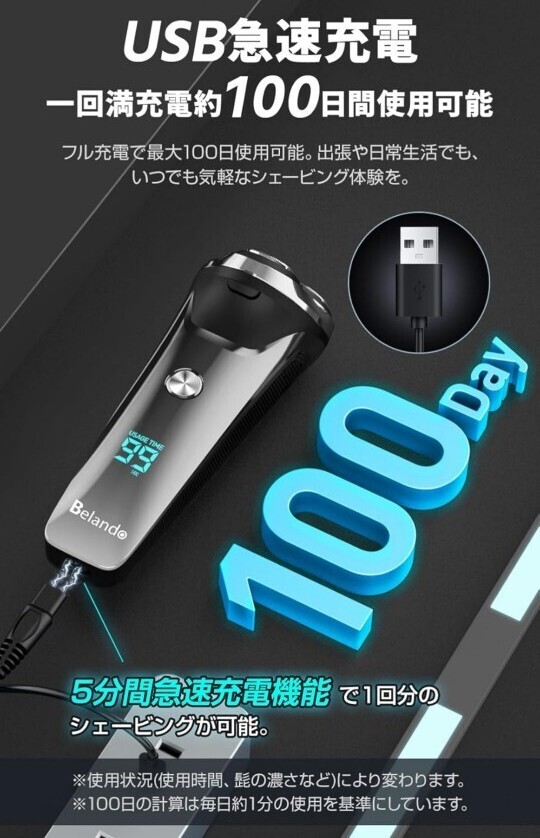 【USB急速充電・長持ちバッテリー】 電動シェーバー がUSB急速充電機能がついており、忙しい朝の準備も待つことなくスムーズに。出張や旅行先でも、パソコンやモバイルバッテリーから簡単に充電可能です。