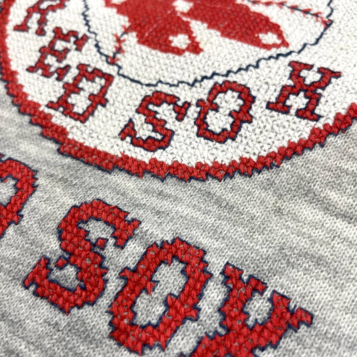 遠目にはプリントに見えますが、実際は刺繍のレッドソックスロゴ。