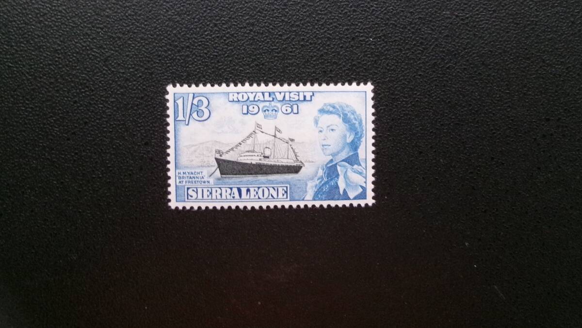 シエラレオネ1961年発行 エリザベス女王肖像とロイヤル・ヨット・ブリタニア号など英国王室の訪問記念切手 1種 薄いヒンジ跡あり 凹版印刷 未使用品です。