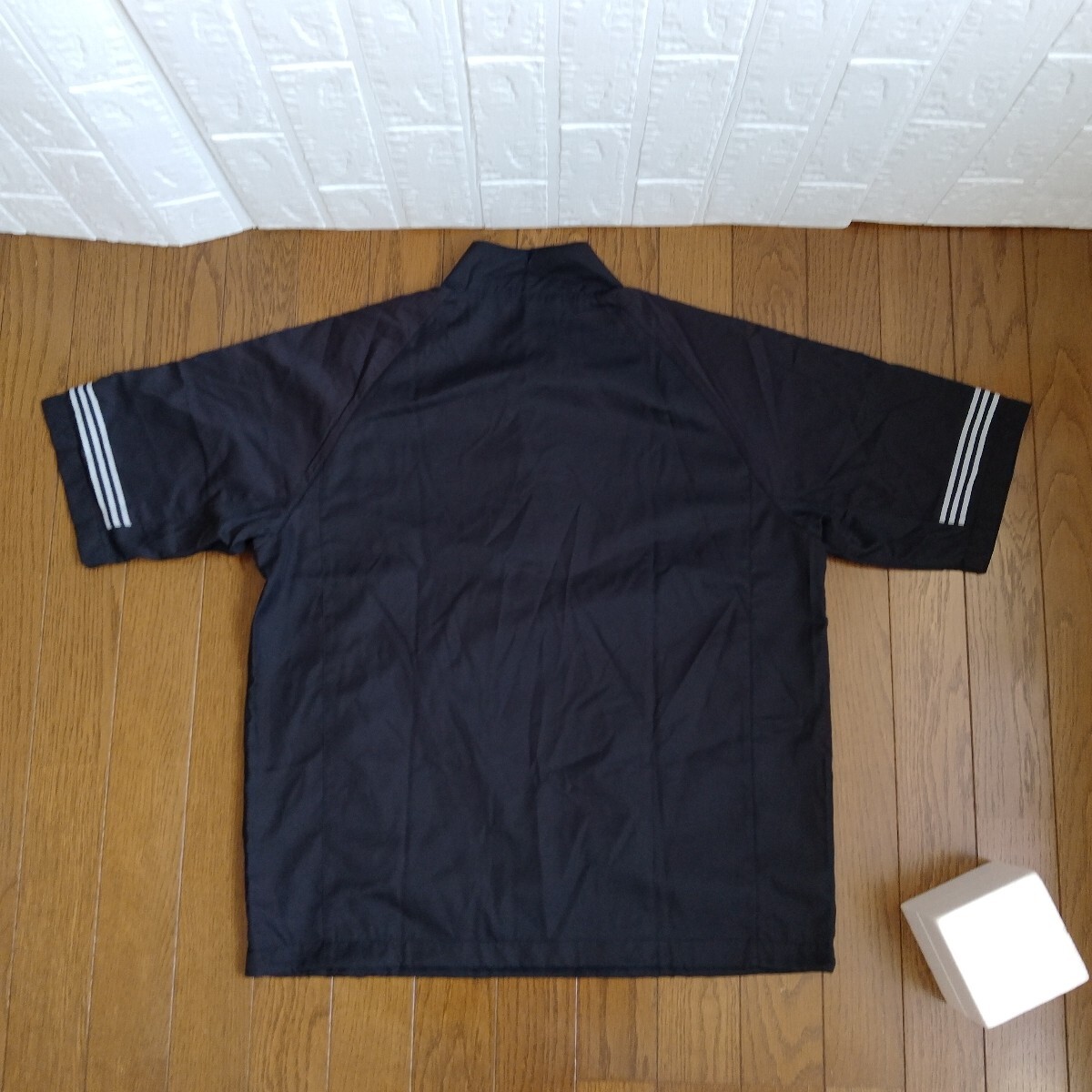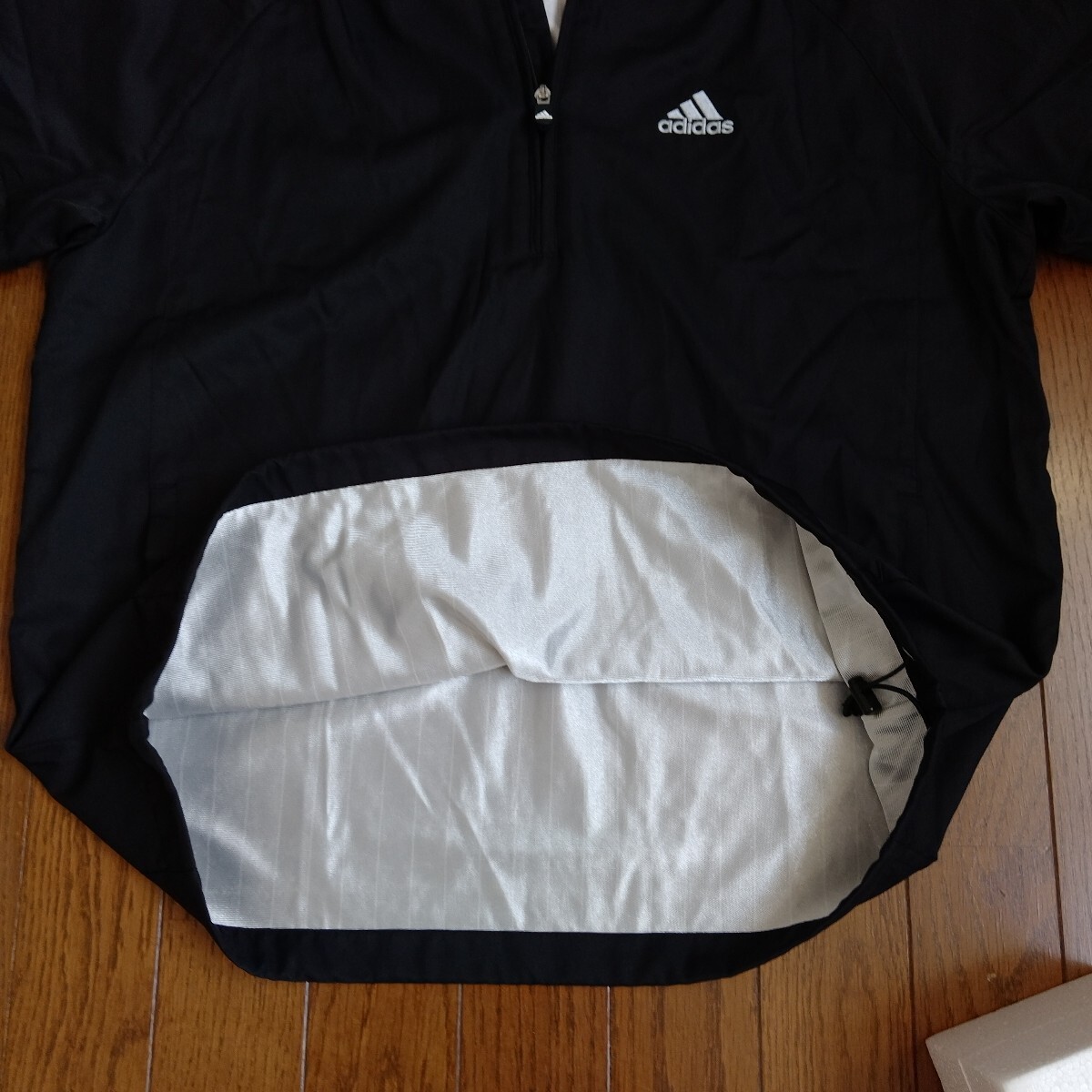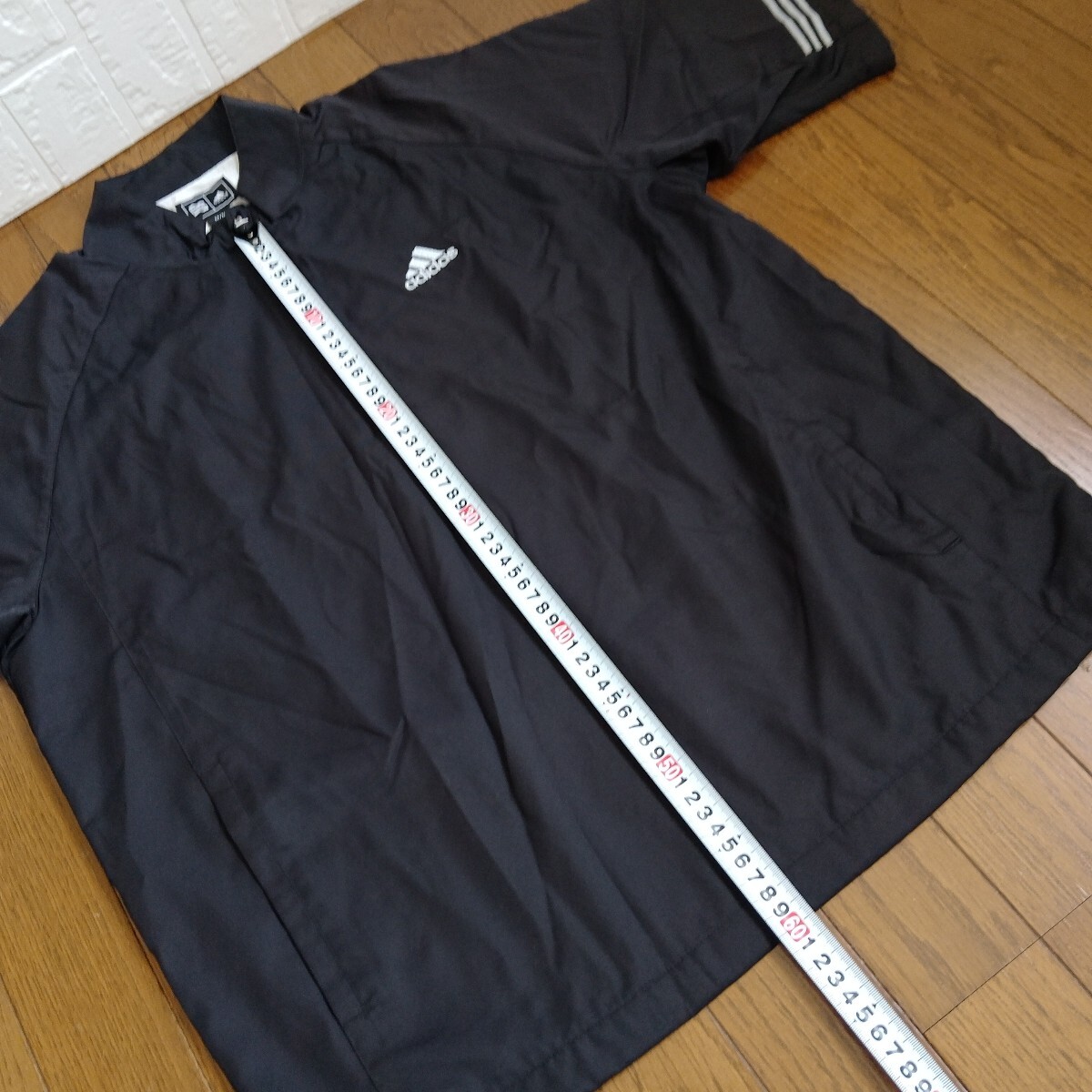 adidas ブラック ハーフジップ半袖 ジャケット Mです。両袖にadidasの3本ライン、裾はゴムで絞れるようになっています。色は黒、左胸に『adidas』のグレーのロゴ刺繍がデザインされています。