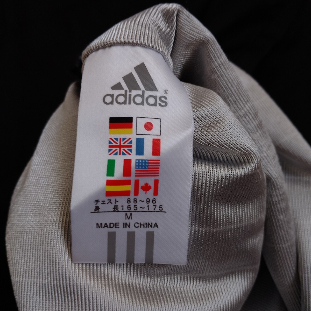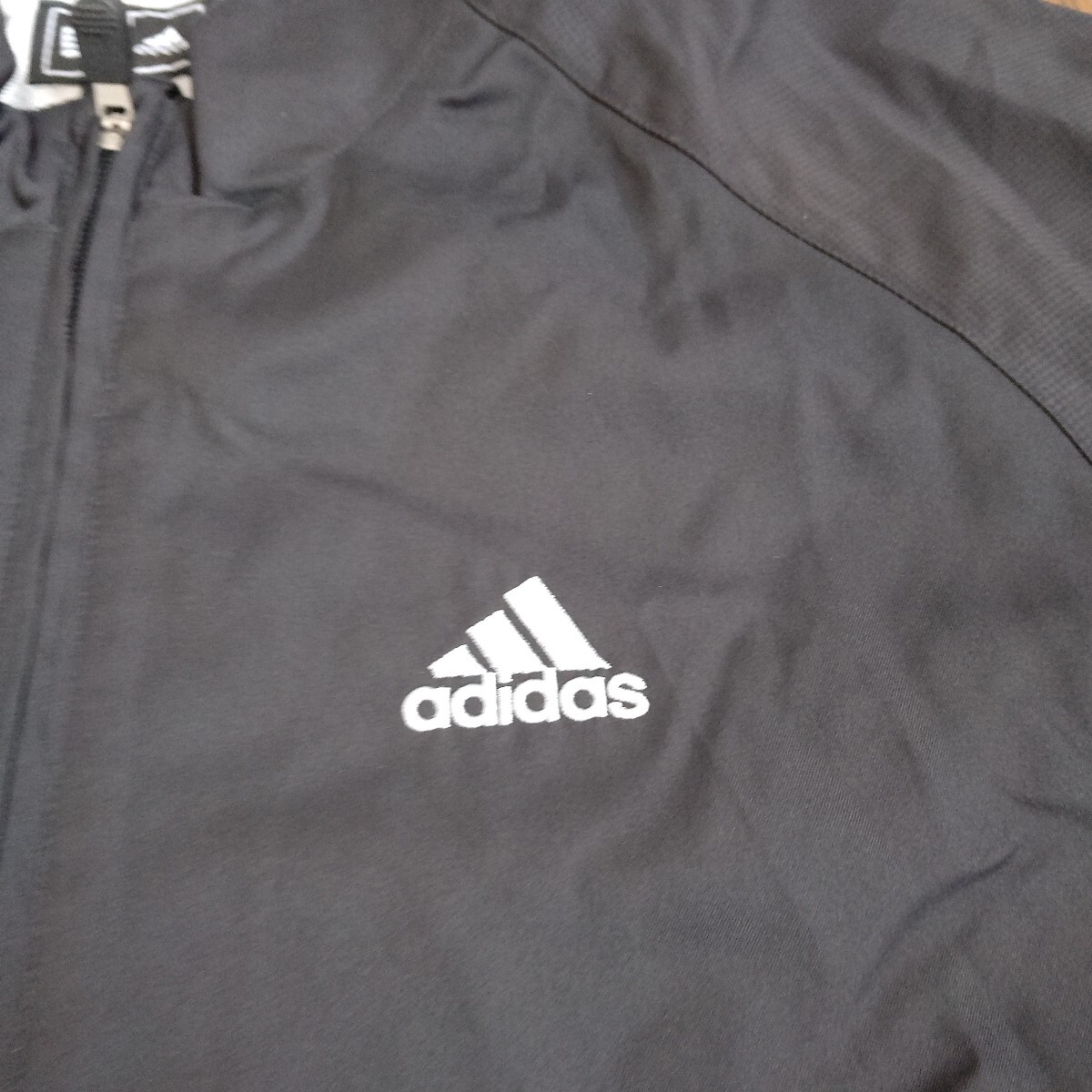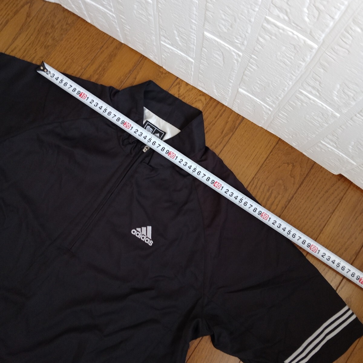 adidas ブラック ハーフジップ半袖 ジャケット Mです。両袖にadidasの3本ライン、裾はゴムで絞れるようになっています。色は黒、左胸に『adidas』のグレーのロゴ刺繍がデザインされています。