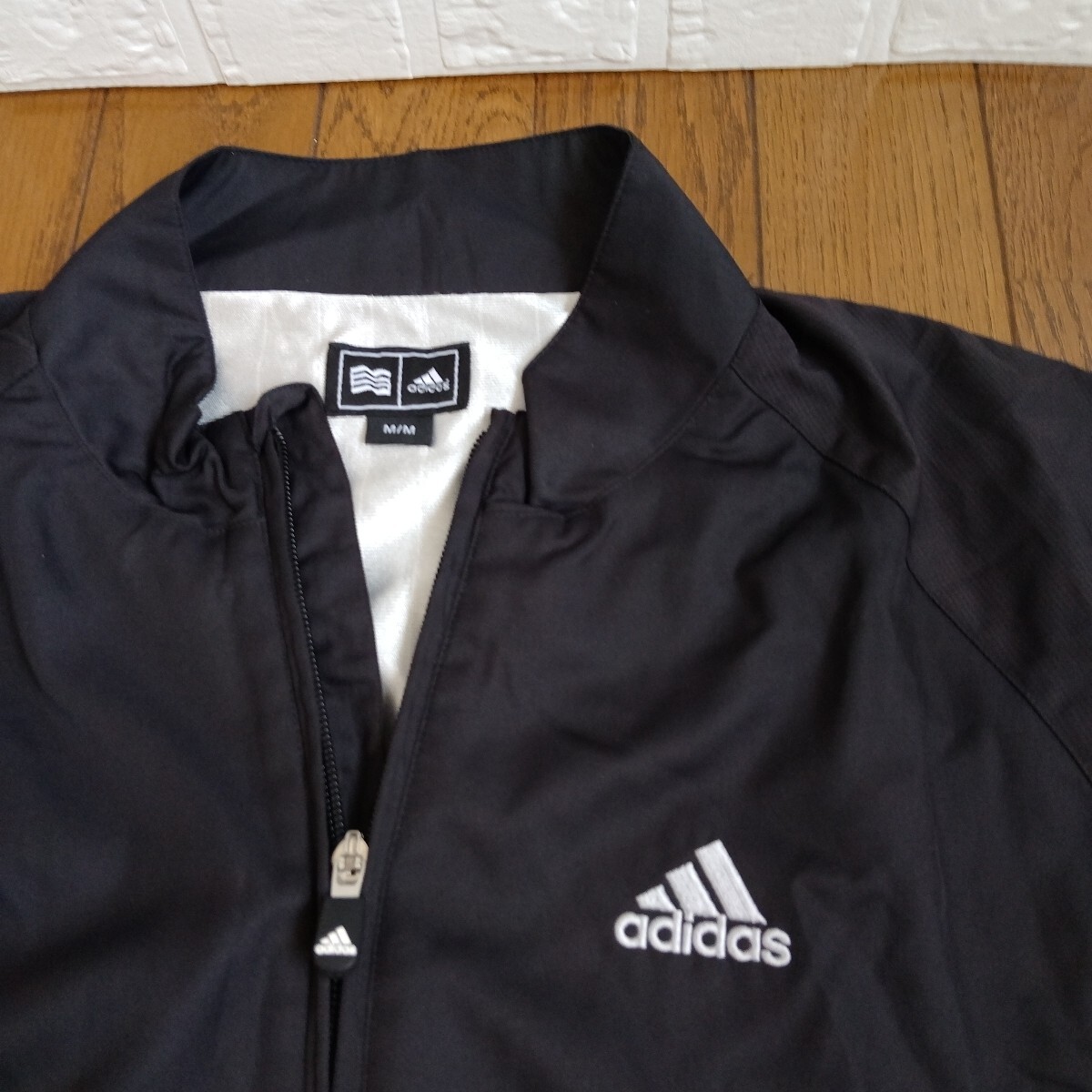 ※adidasのブラック半袖ジャケット、ジップアップデザインでゴルフに最適。