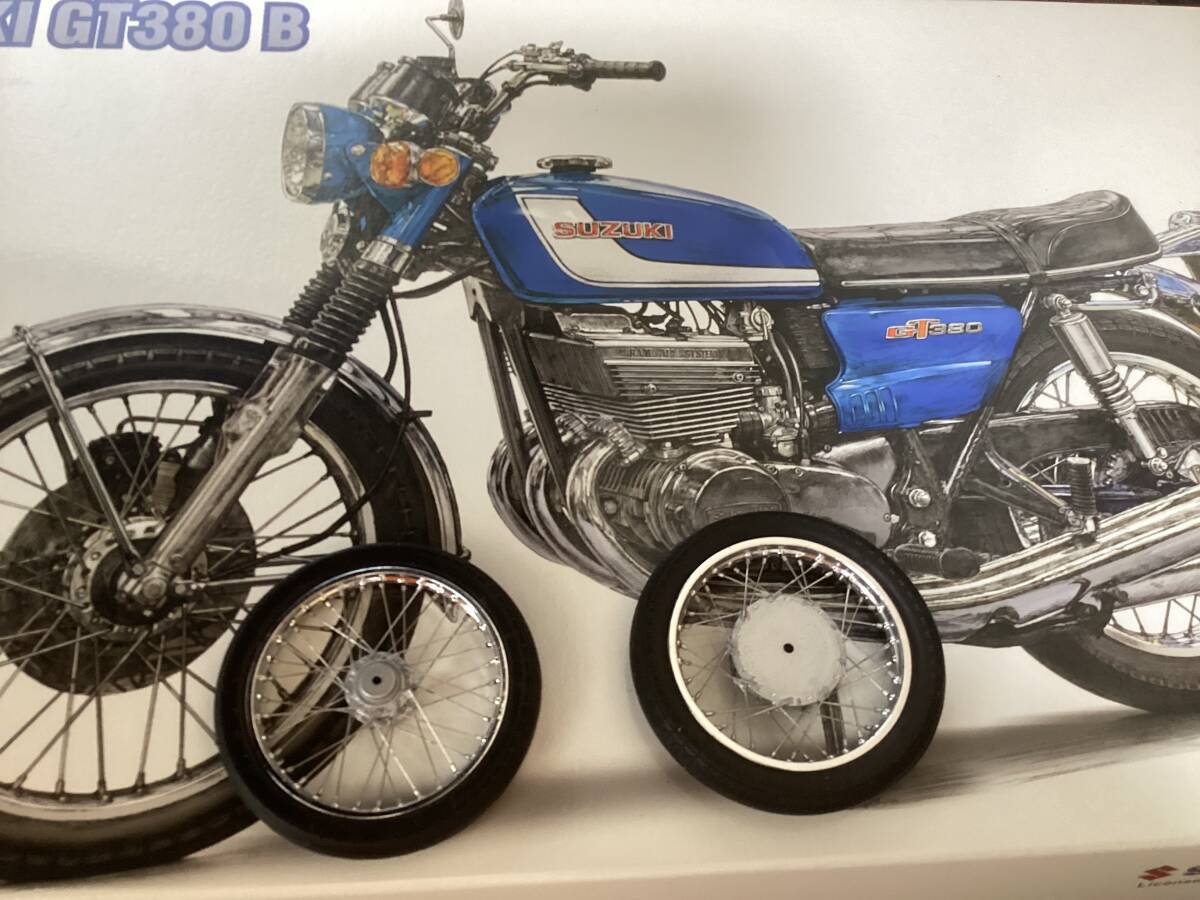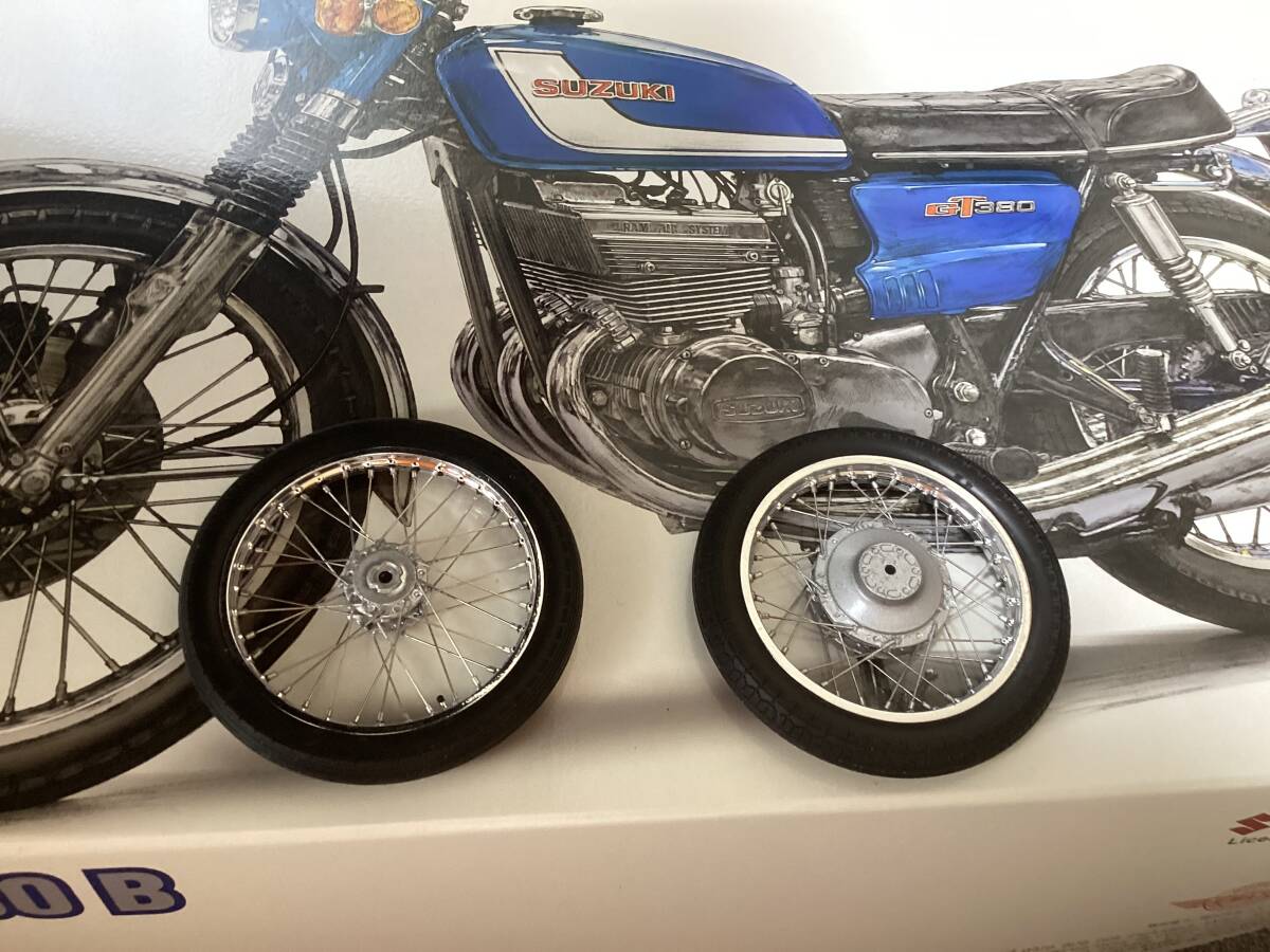 ハセガワ1/12スケールプラモデル スズキGT380用スポーク変更済み前後ホイール(落札者様同パーツ先発送条件有り)