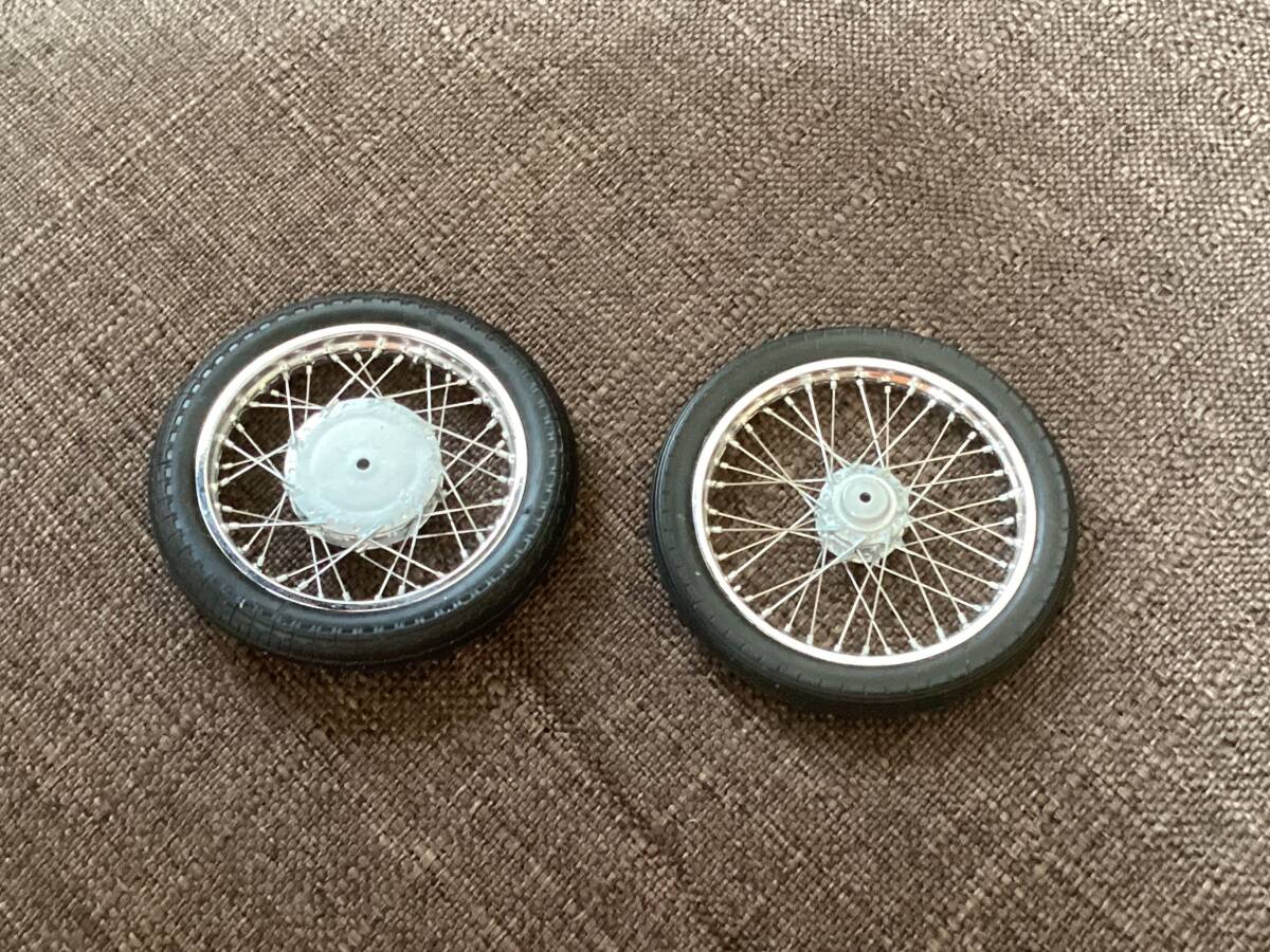プラモデルキットをお持ちの方で落札後にホイールのパーツとタイヤを送って頂ければ、画像のスポーク交換済みの前後ホイールと組みつけたタイヤのセットをお送りします