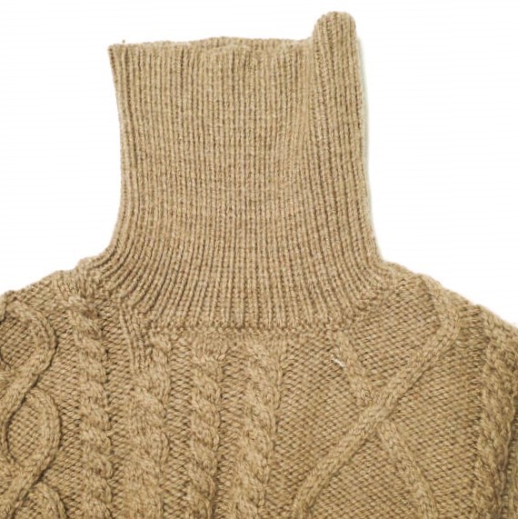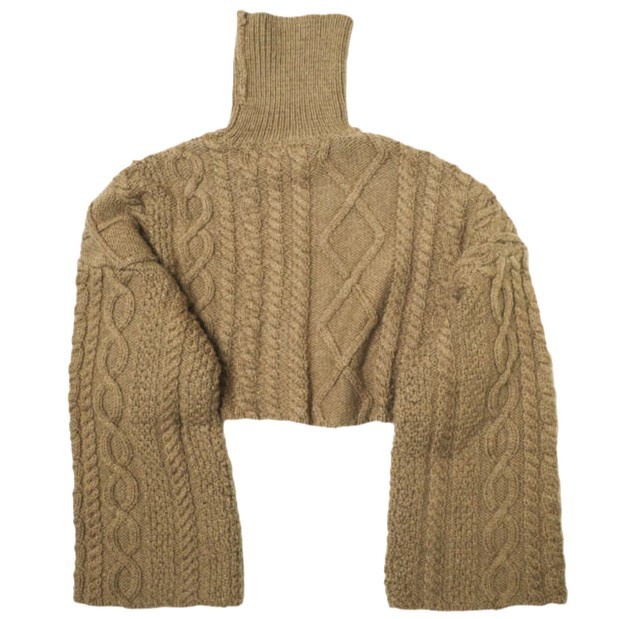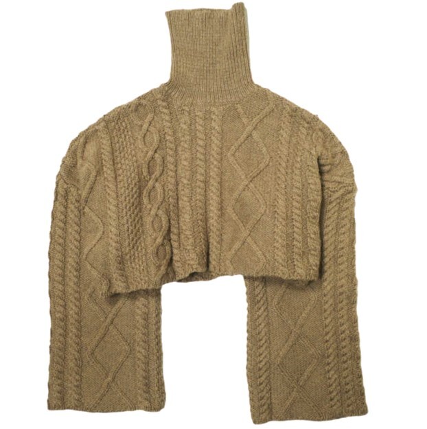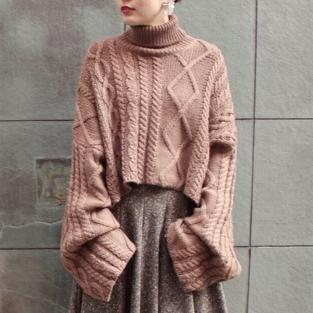 こちらはケーブル編みのクラシックなタートルネックセーターですが、丈が短くなるだけでぐっとモダンな雰囲気に見えてきます。
