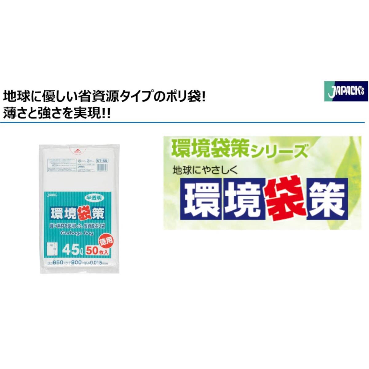ジャパックス ゴミ袋 環境袋策 半透明 45L 横65×縦80cm 厚み0.015mm 強い素材を使用した 省資源 ポリ袋 KT-56 50枚入