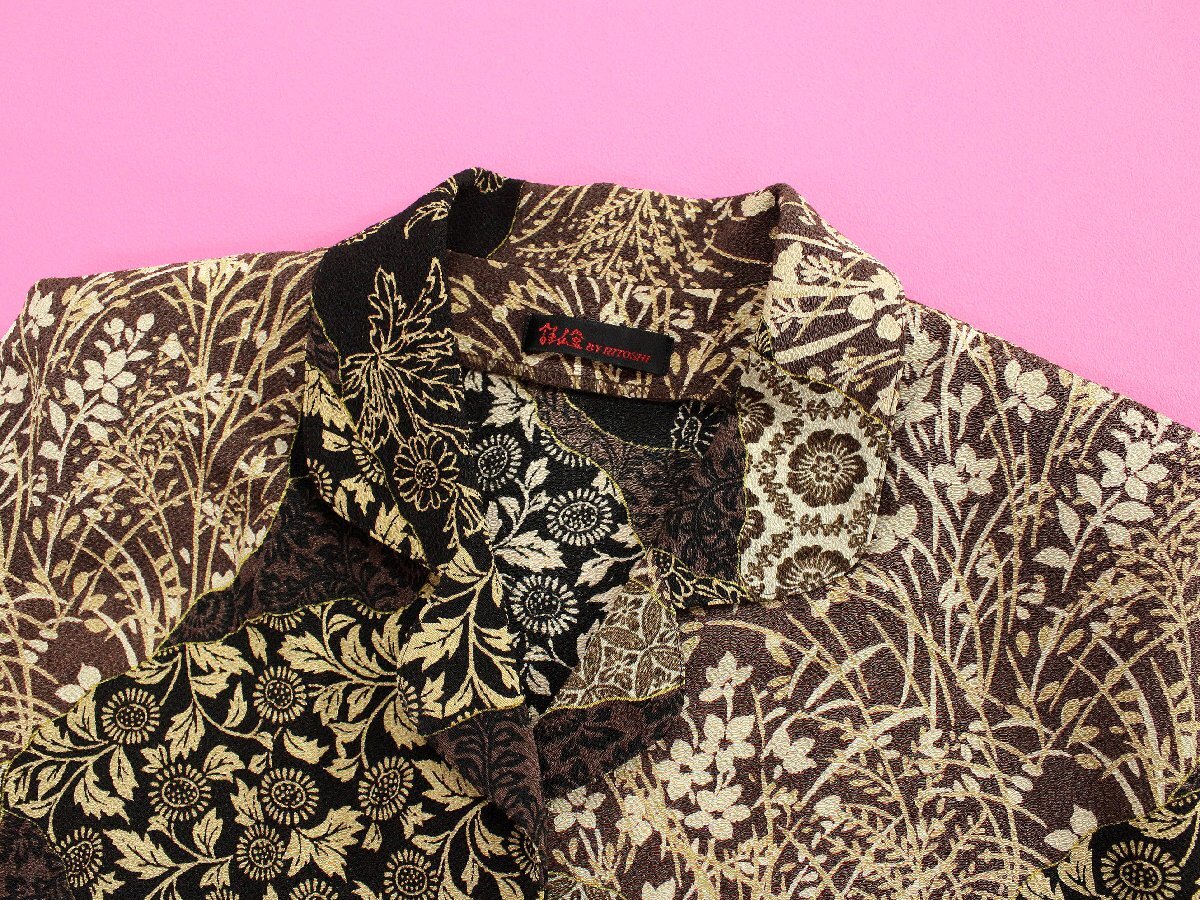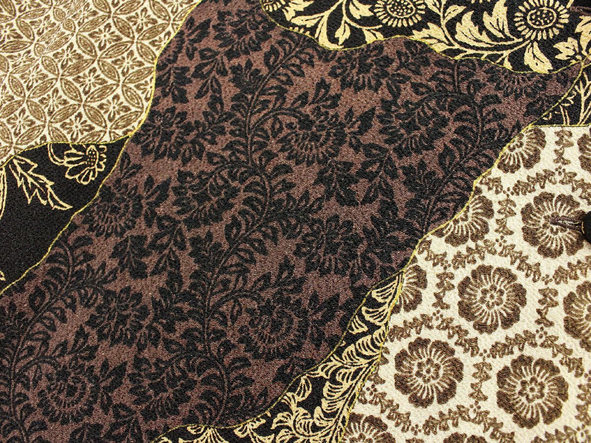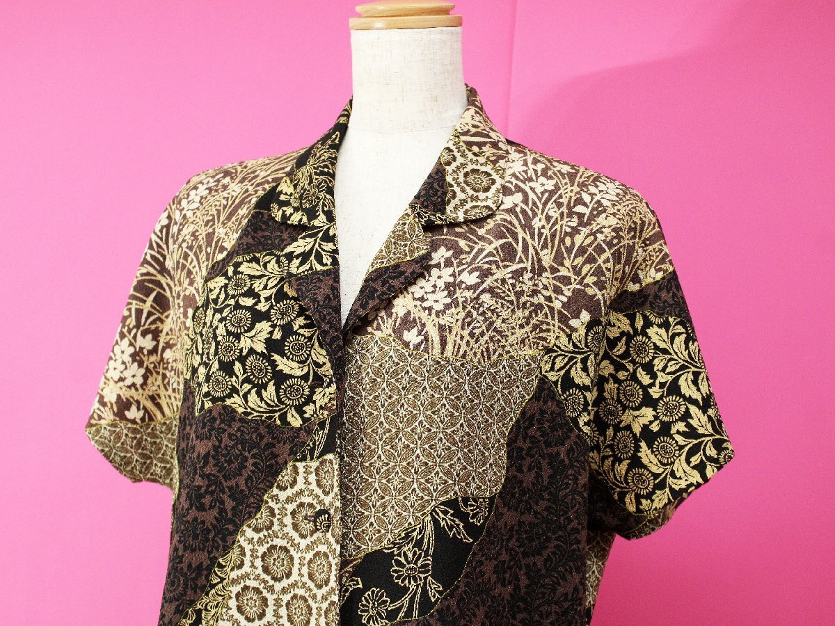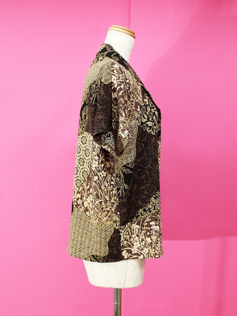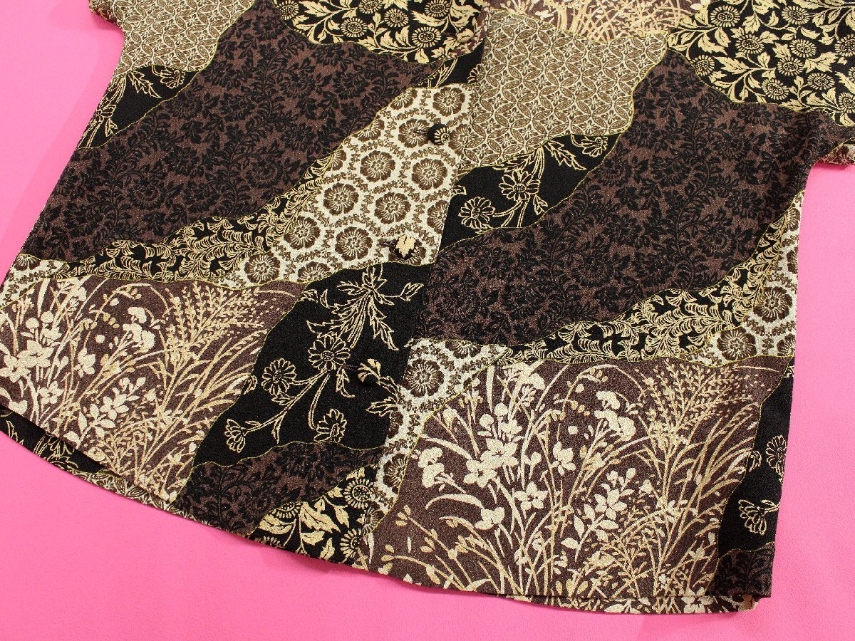 美品 詩仙堂 洗えるちりめん織り花柄Vネック半袖ブラウスジャケット 黒ベージュ rl539