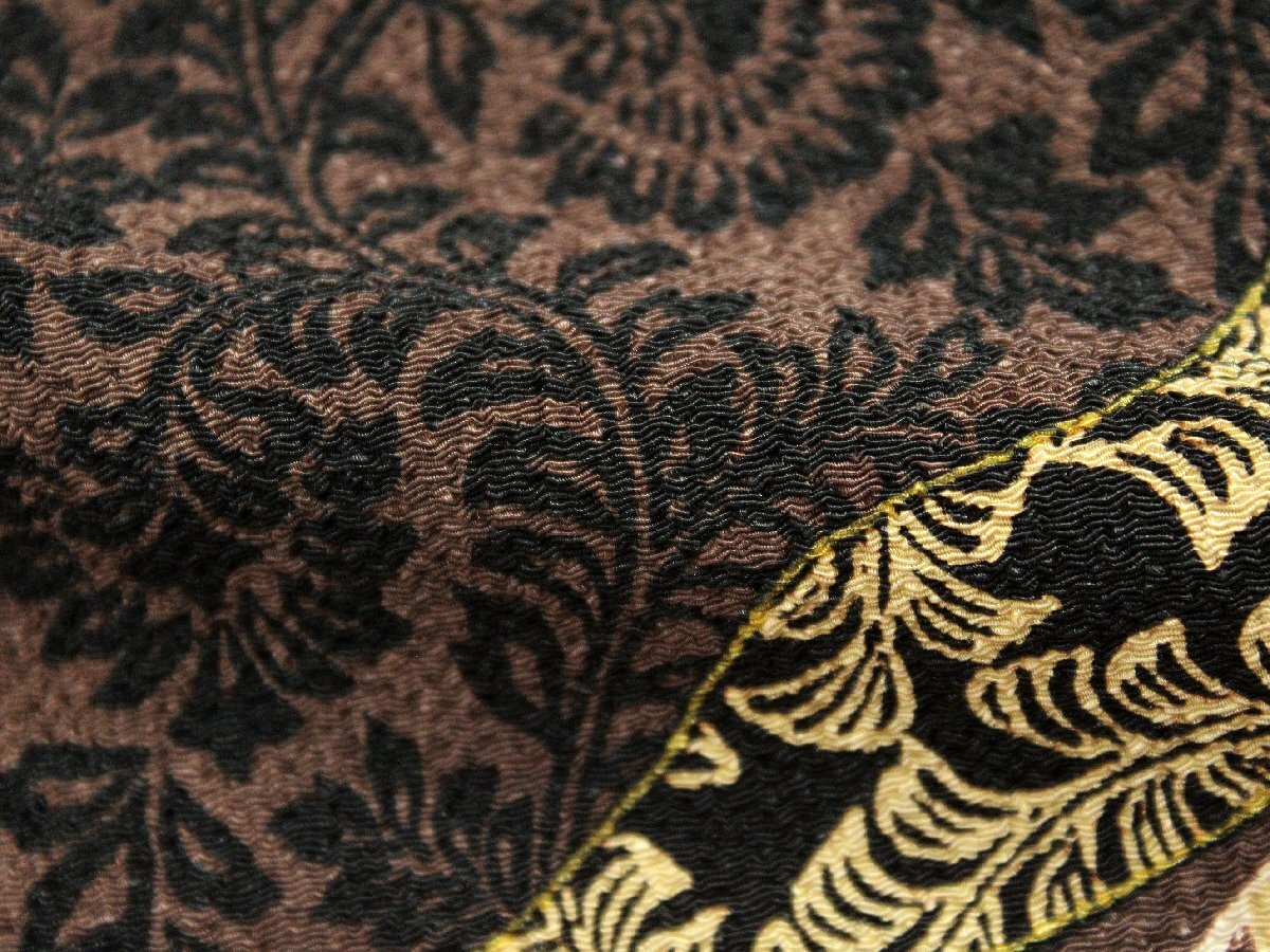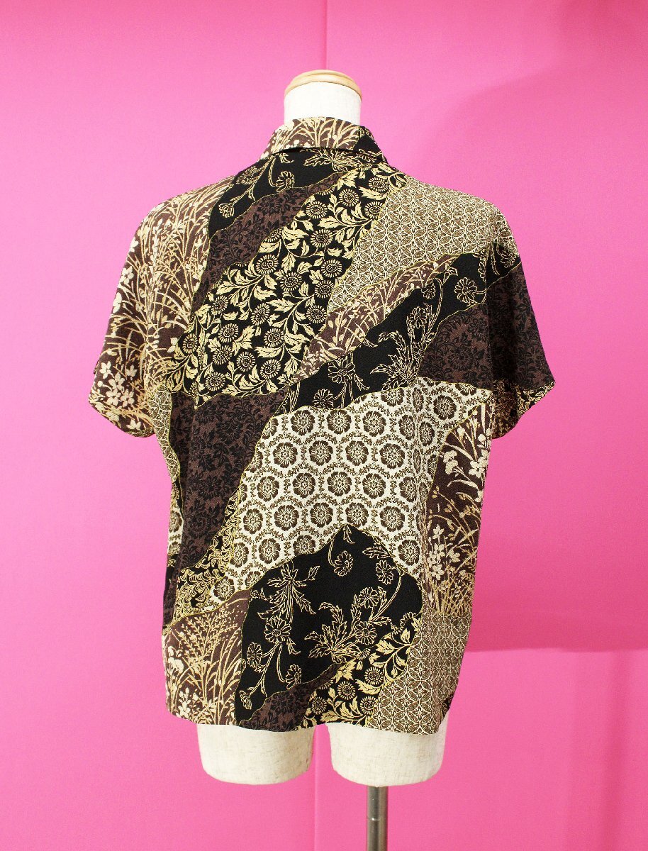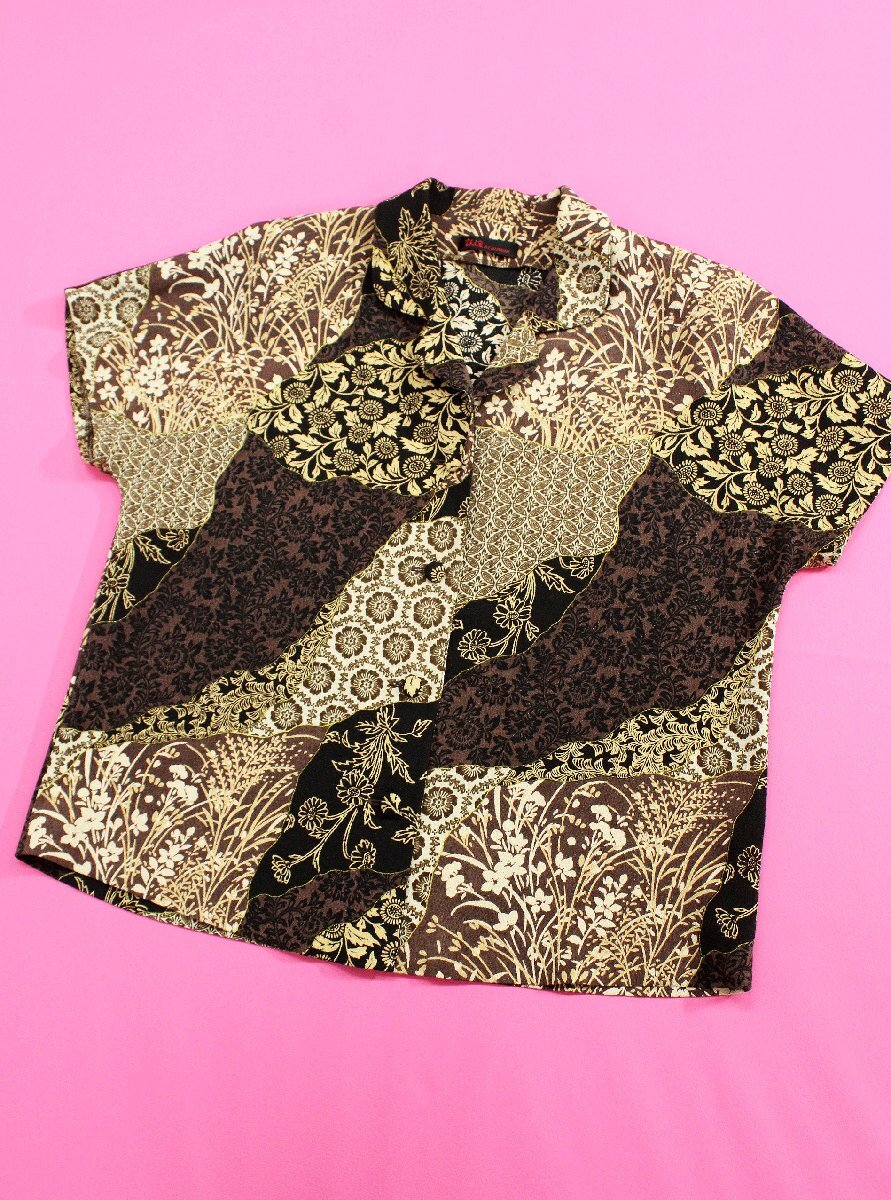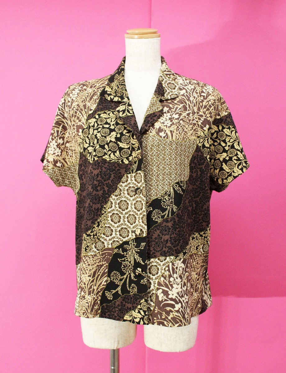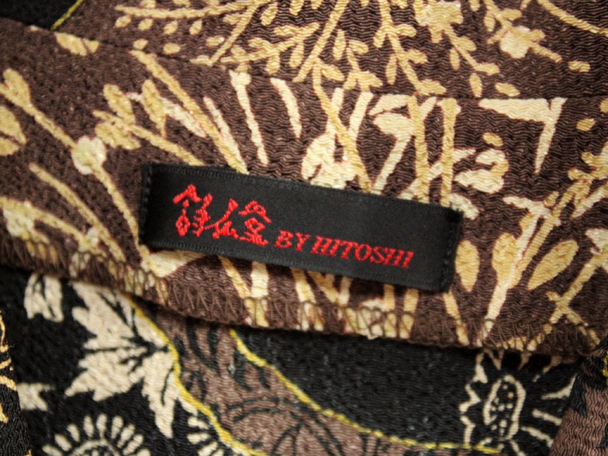 美品 詩仙堂 洗えるちりめん織り花柄Vネック半袖ブラウスジャケット 黒ベージュ rl539