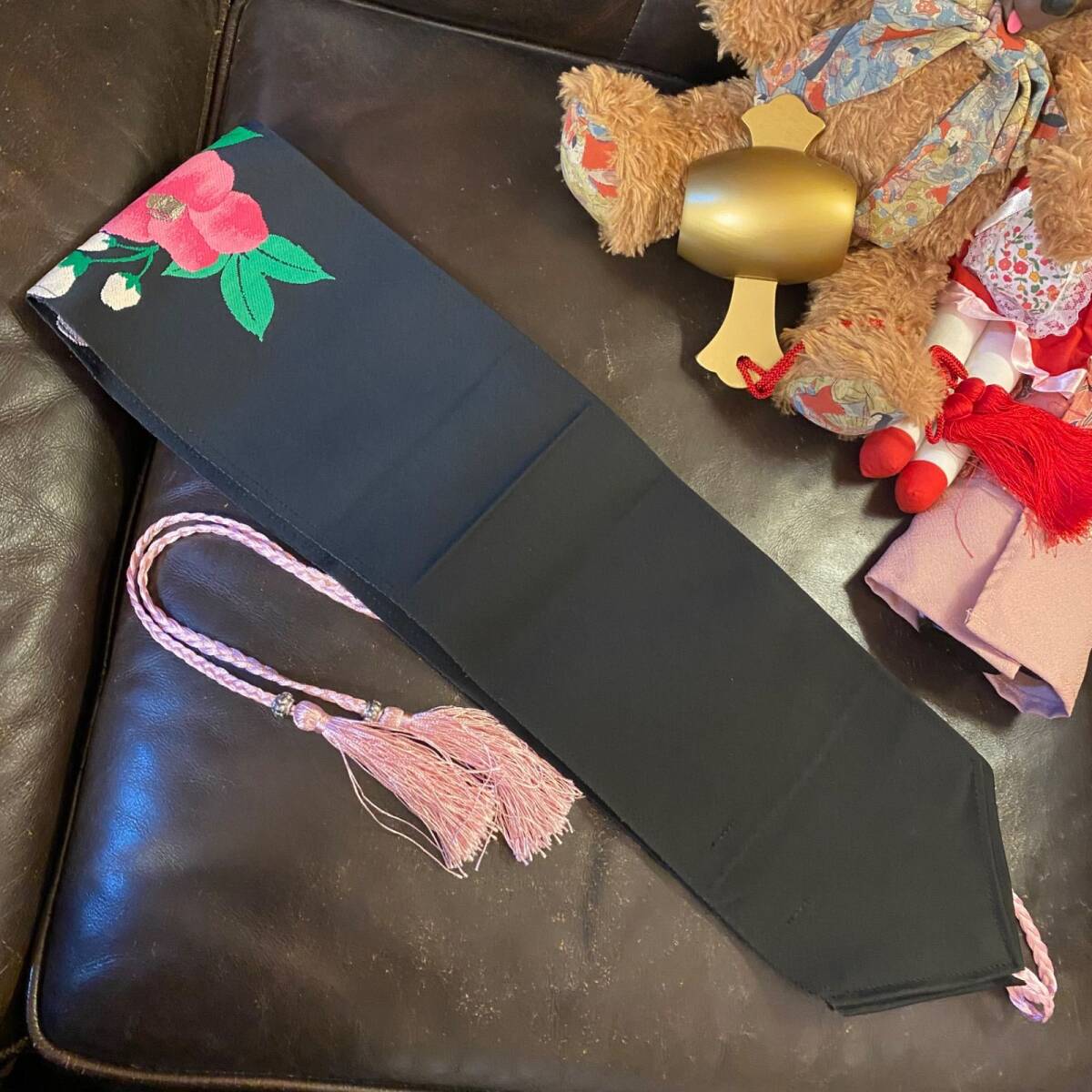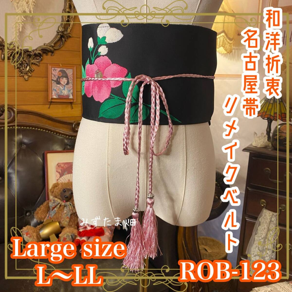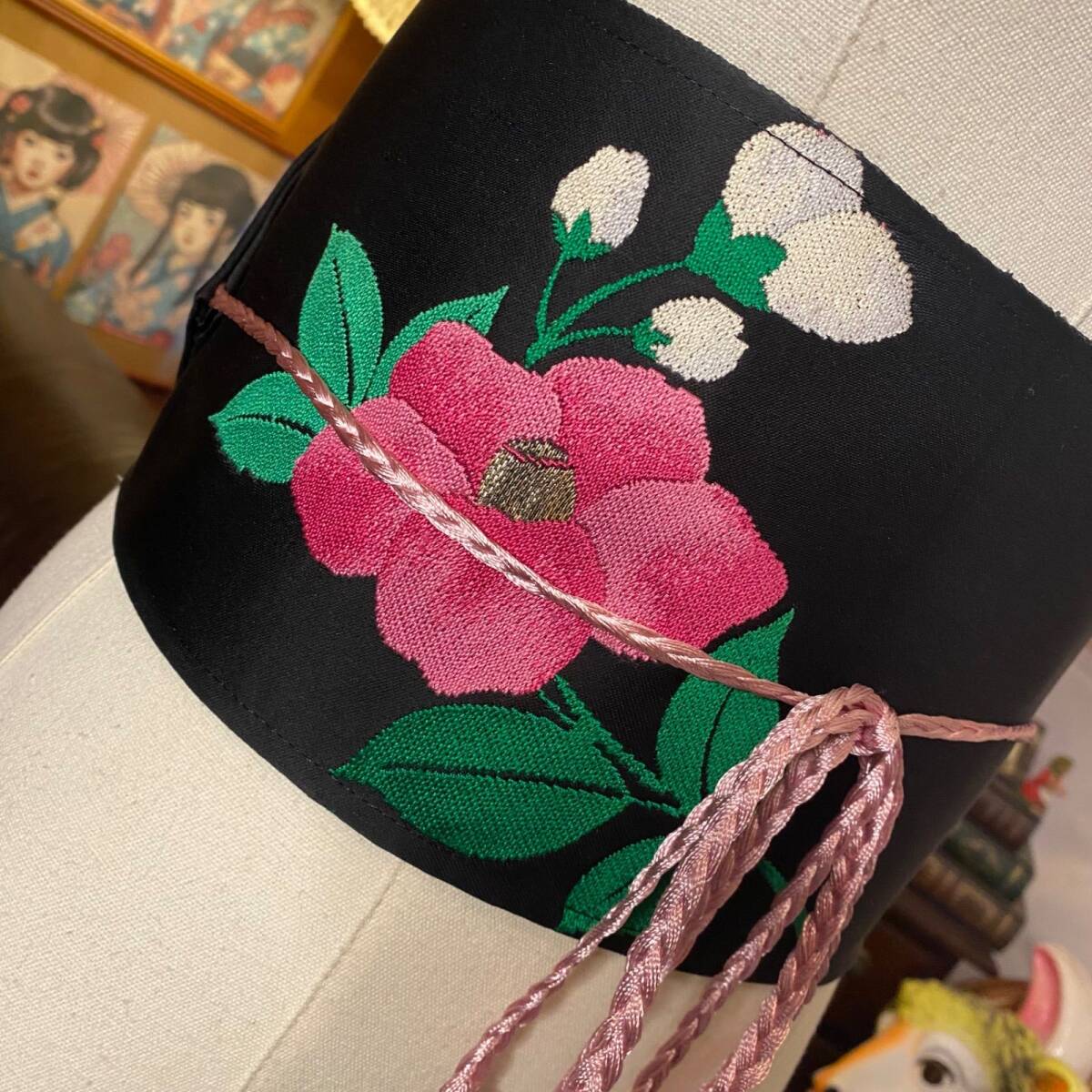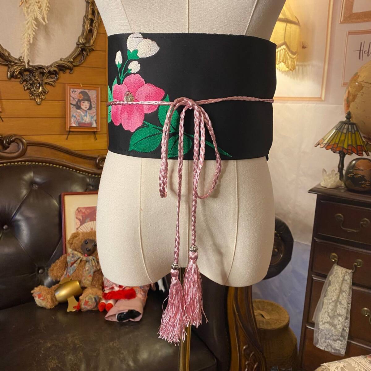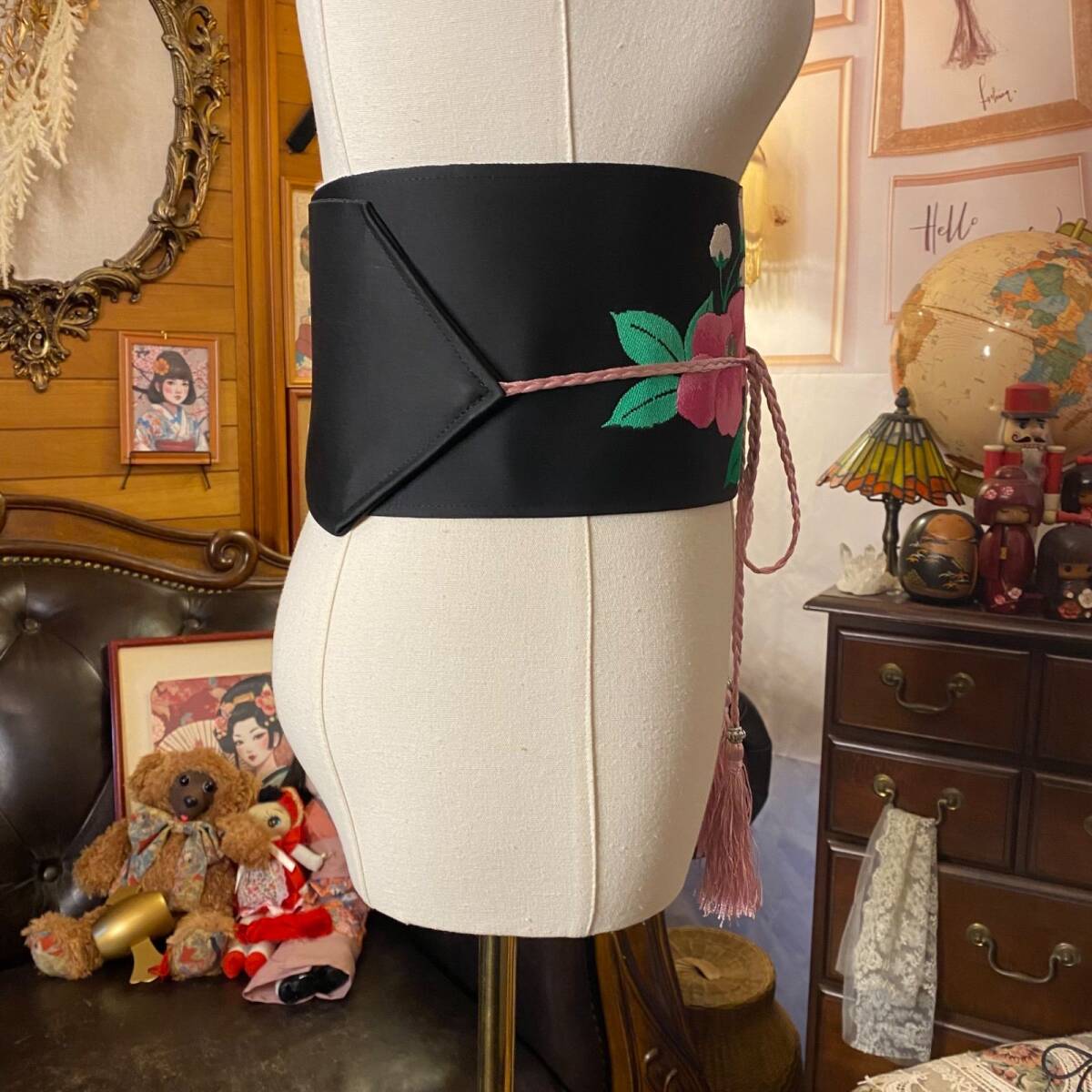 【名古屋帯 リメイク サッシュベルト 飾り帯 和洋折衷 ハンドメイド レトロ 古着 L〜LL対応 漆黒に、ひときわ鮮やかな椿が咲き零れる。 ROB-123】