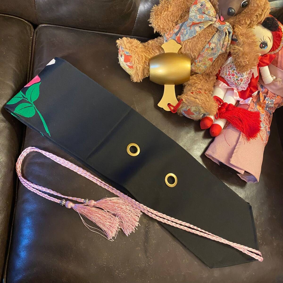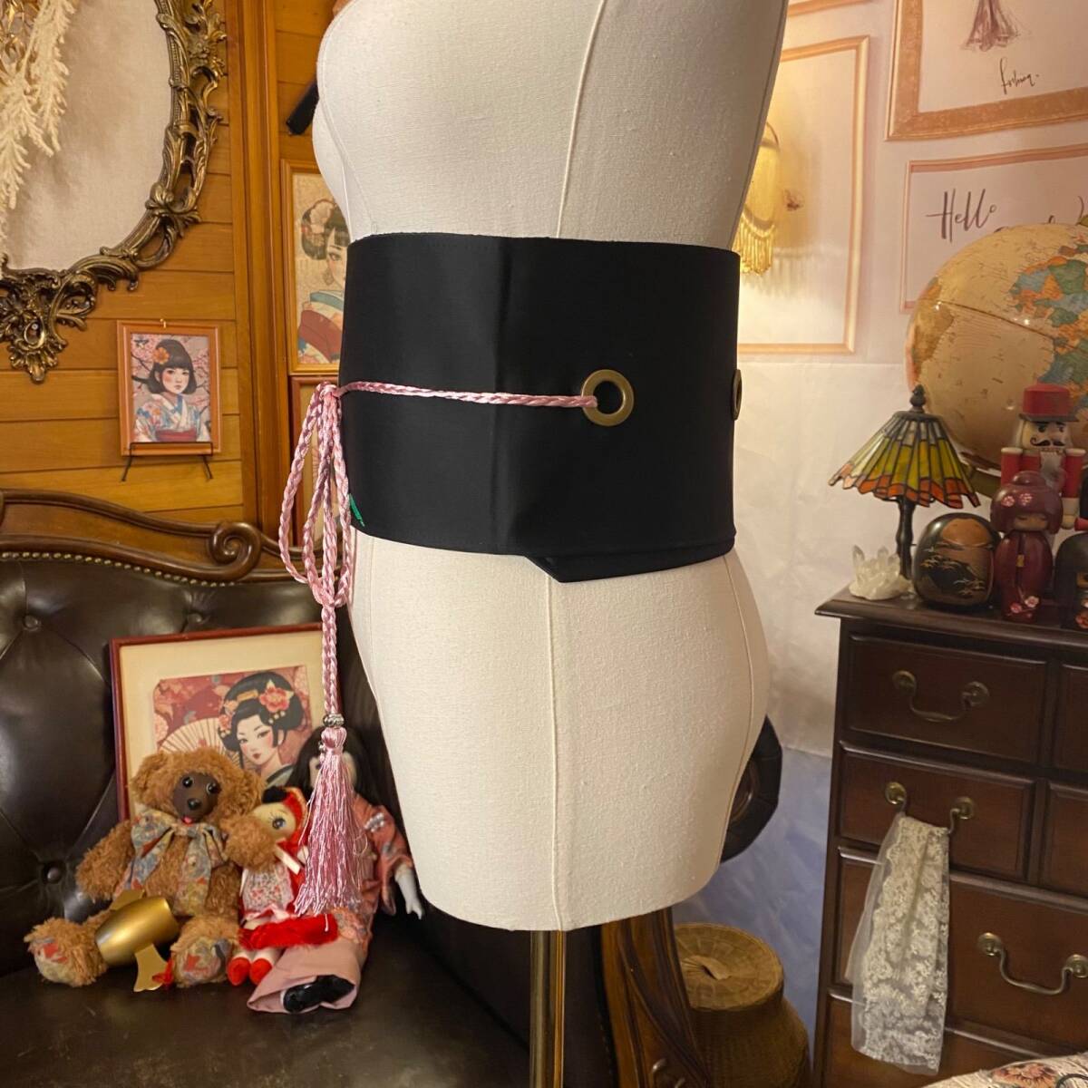 漆黒に、ひときわ鮮やかな椿が咲き零れる。そんなドラマティックな一瞬を切り取った名古屋帯を、モードなサッシュベルトへリメイクしました。マットブラックをキャンバスに、フューシャピンクの大輪と、月光に照らされた白い蕾、そしてエメラルドグリーンの葉脈が艶やかなサテン刺繍で立体的に浮かび上がります。ウエストを一巻きするだけで、静寂の闇にひそむ官能と可憐さを同時に纏わせる。カジュアルなデニムにも、ドレスアップスタイルにも“ワンアクセントで物語を生む”リメイクベルトです。