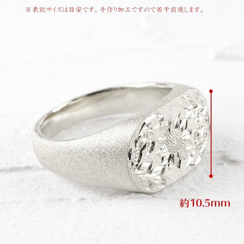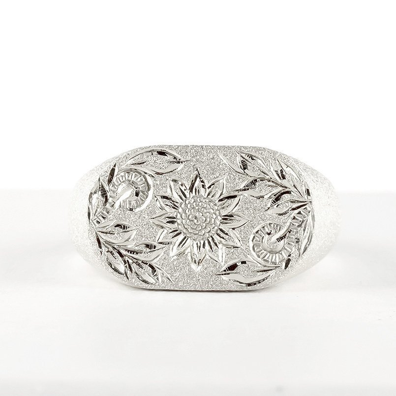商品コード:210527101p【配送】・発送は3週間ほどです【おすすめポイント】キラキラと輝くテクスチャと彫りの調和が美しい印台風ボリュームリングヒマワリの明るくポジティブな印象が爽やかさと個性をアピール頑張っている自分へのご褒美や、大切な人へのプレゼントにおススメ【商品詳細】・材質:プラチナ900(品質を保証するpt900の刻印)・大きさ:リング最大幅 約 10.5ミリ【リングサイズ】・10-16号までサービス それ以上のサイズは別途お値段がプラスされます。・0.5号刻みも対応しておりますので、ご希望の場合はご要望欄にご記載ください。誕生日 記念日 プレゼント ジュエリー リング 指輪 幅広 印台 シグネットリング ひまわり 向日葵 花 彫り ピンキーリング 地金 ブライダルリング エンゲージリング 婚約指輪 マリッジ 結婚 婚約 ウェディング プロポーズ 結婚祝い ジェンダーレス ハンドメイドジュエリー ギフト プレゼント 贈り物 フリースタイル ニッケルフリー ユニセックス LGBTQ 男女兼用 ジェンダーフルイド バディジュエリー 小さいサイズ 大きいサイズ 対応 福袋 30代 40代 50代