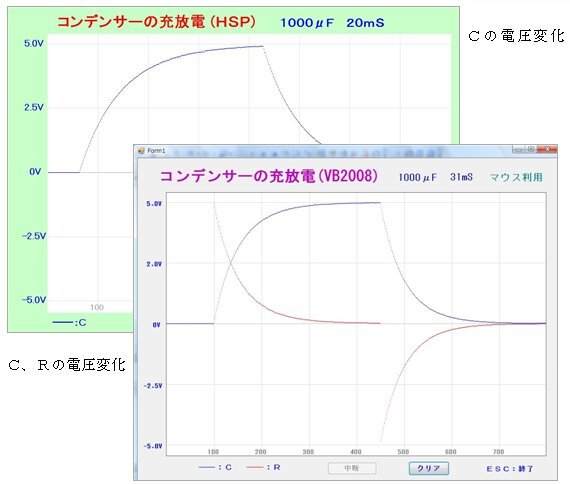 ●測定間隔はHSPで約20ミリ秒で最大800回測定して1画面の測定終了です。VBは30ミリ秒間隔です。またCにかかる電圧のみ表示とC,Rにかかる電圧の表示の選択ができます。(2つ目の写真) コンデンサーの容量は1000μFに固定です。(半田こてを使用し交換は可能)、可変抵抗の値を変えることで充電や放電の曲線の時間的変化の様子が視覚できます。プログラムを1行変えて測定間隔も変更できます。
