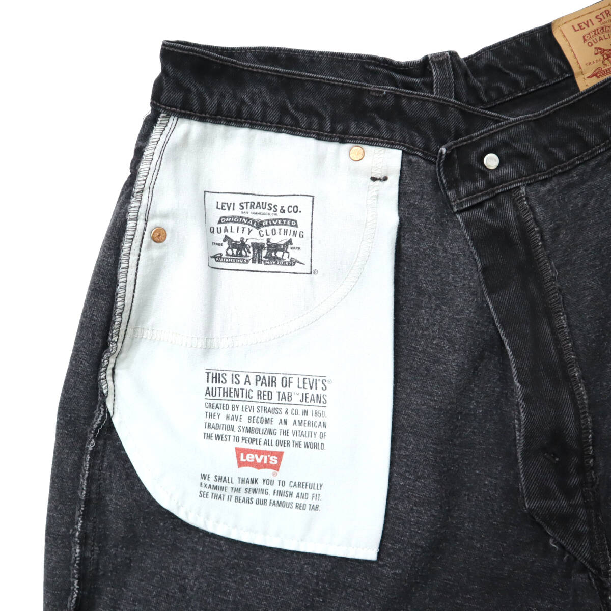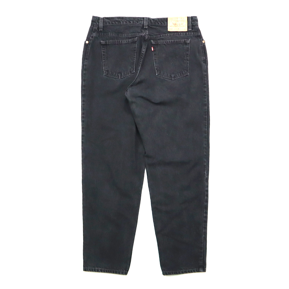 リーバイスの550です。内タグが無くなっていますが、ボタン裏の刻印が647でメキシコ製、2000年前後のモデルだと思います。シルエットはリラックスフィット テーパード、腿あたりが太めで、裾にかけて細くなります。サイズ表記も無しですが、レディースサイズだと思います。実寸でウェスト36.5インチ、レングス31インチ程と大きめですので、メンズとしても十分ご使用頂けるサイズ感です。ブラックデニムは、アメリカでも年々見つかりづらくなっておりますので、この機会に是非ご検討下さい。