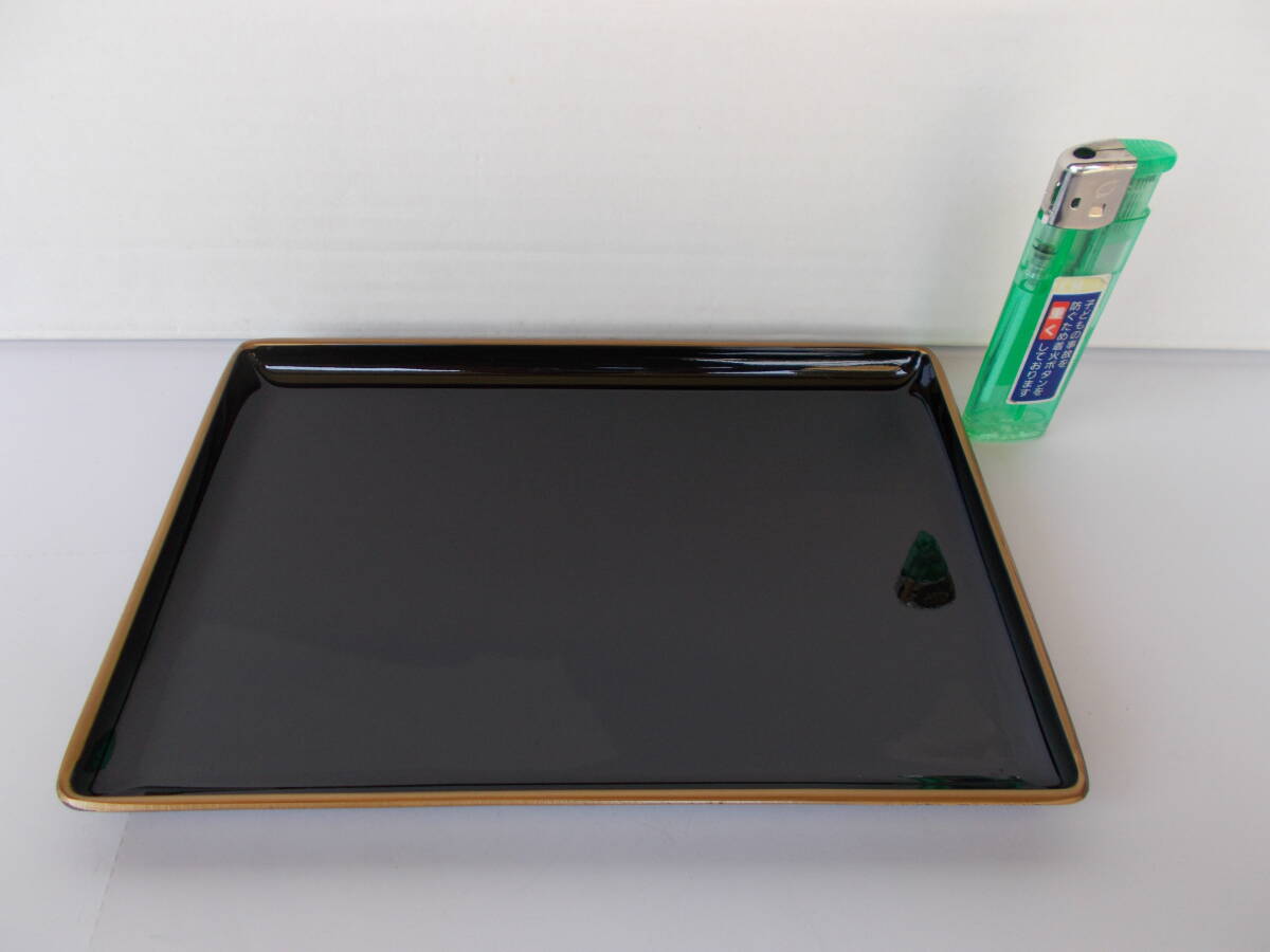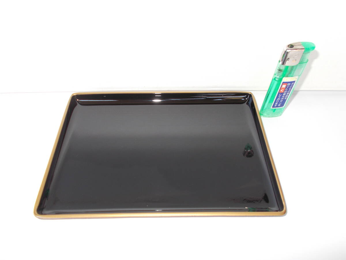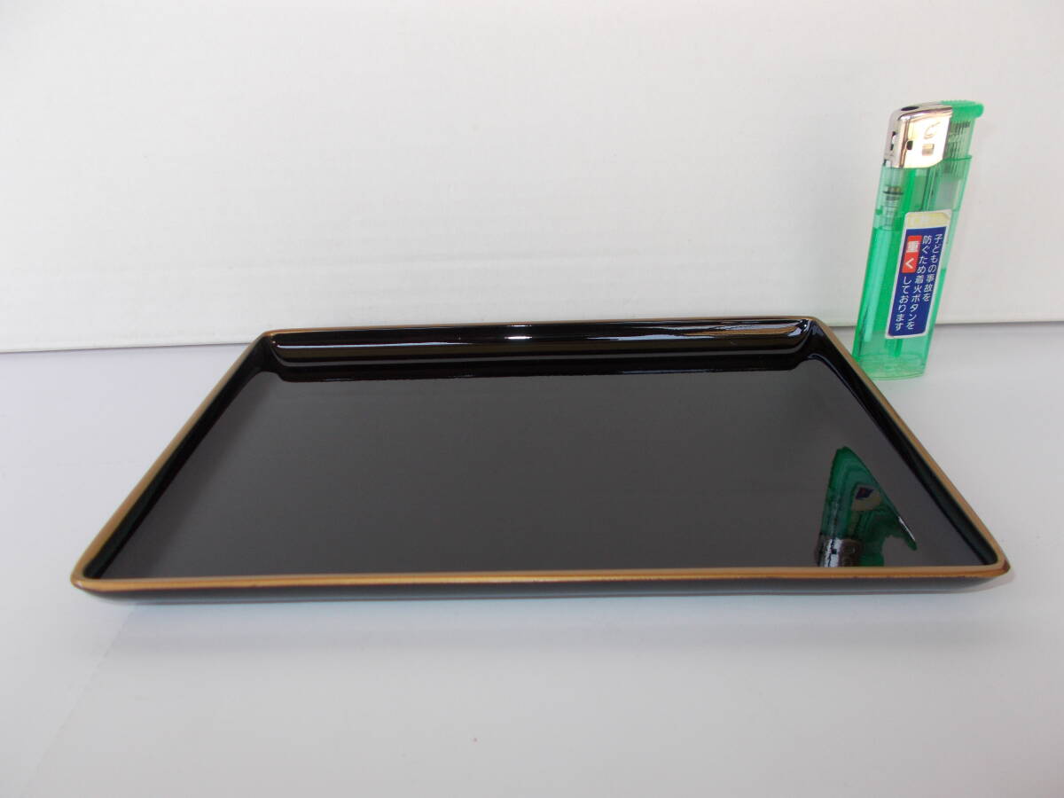 中古品の名刺盆、樹脂製名刺盆(黒フチ金)6.5寸が1個です。画像のライター(高さ8.5㎝)はサイズ確認用で付属はしません。
