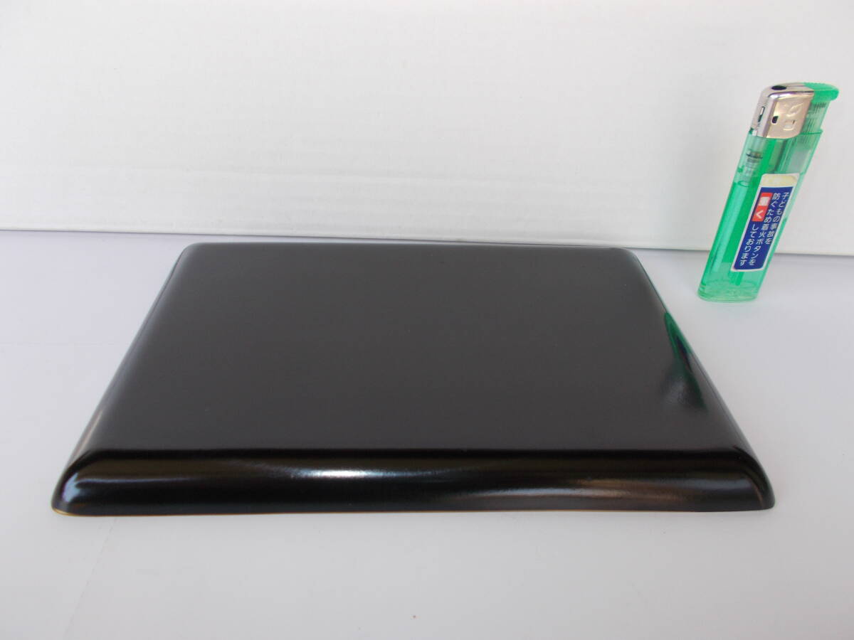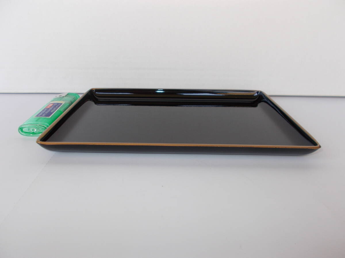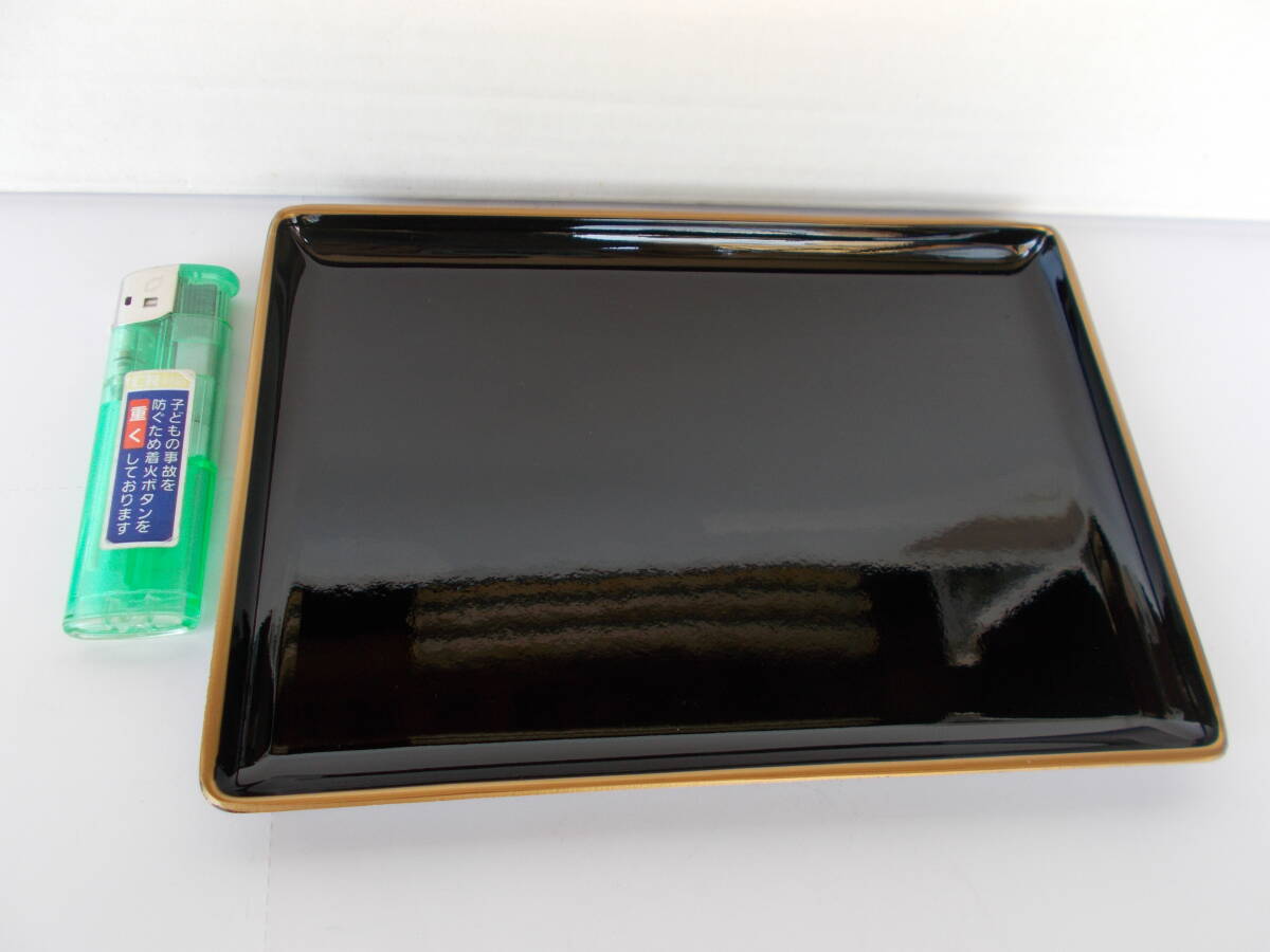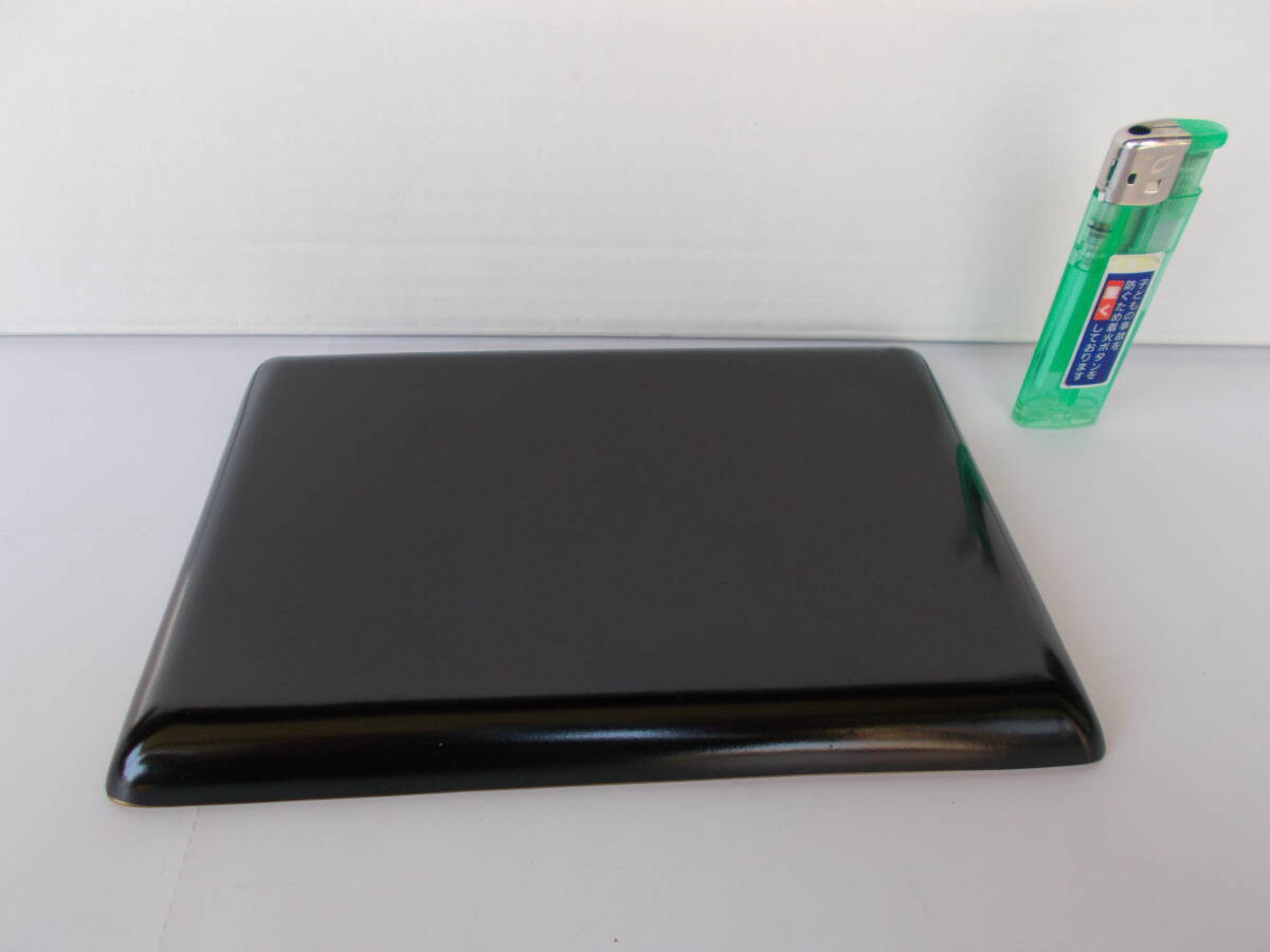 中古品の名刺盆、樹脂製名刺盆(黒フチ金)6.5寸が1個です。画像のライター(高さ8.5㎝)はサイズ確認用で付属はしません。