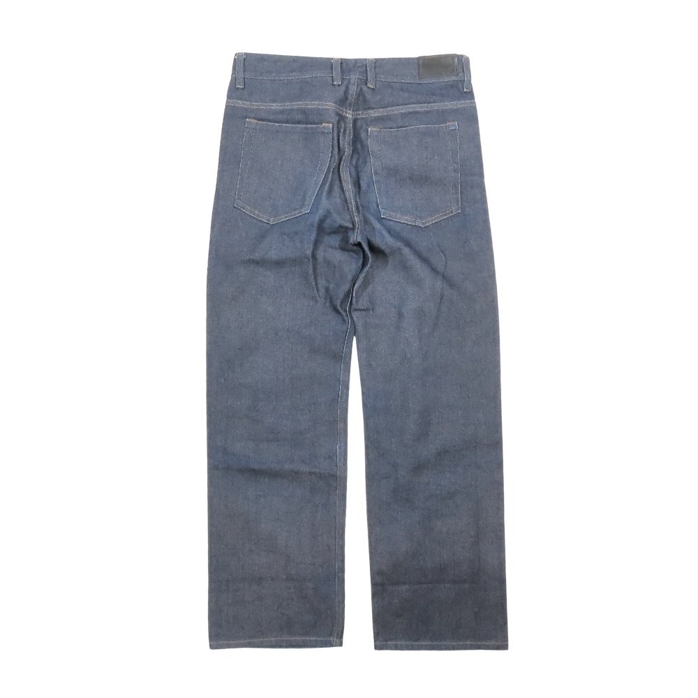 仕様:ボタンフライ式のワイドデニム。後ろ側にロゴ刻印がされたワッペンがついたデザイン。