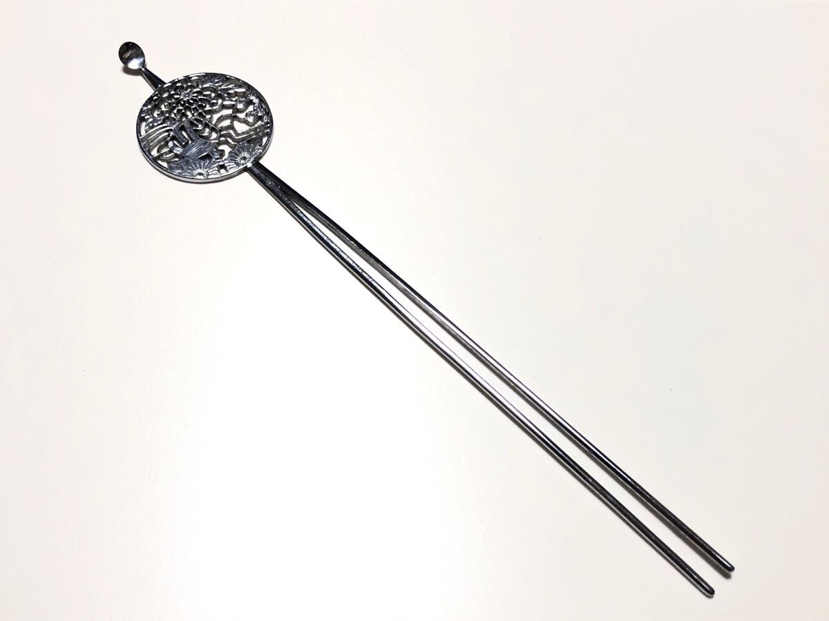 アンティークの彫金を施し、透かし細工を施した、打ち出の小槌に花細工の平打ち簪です。