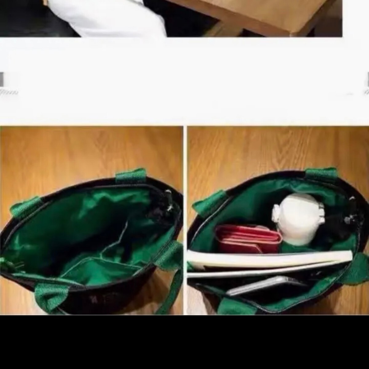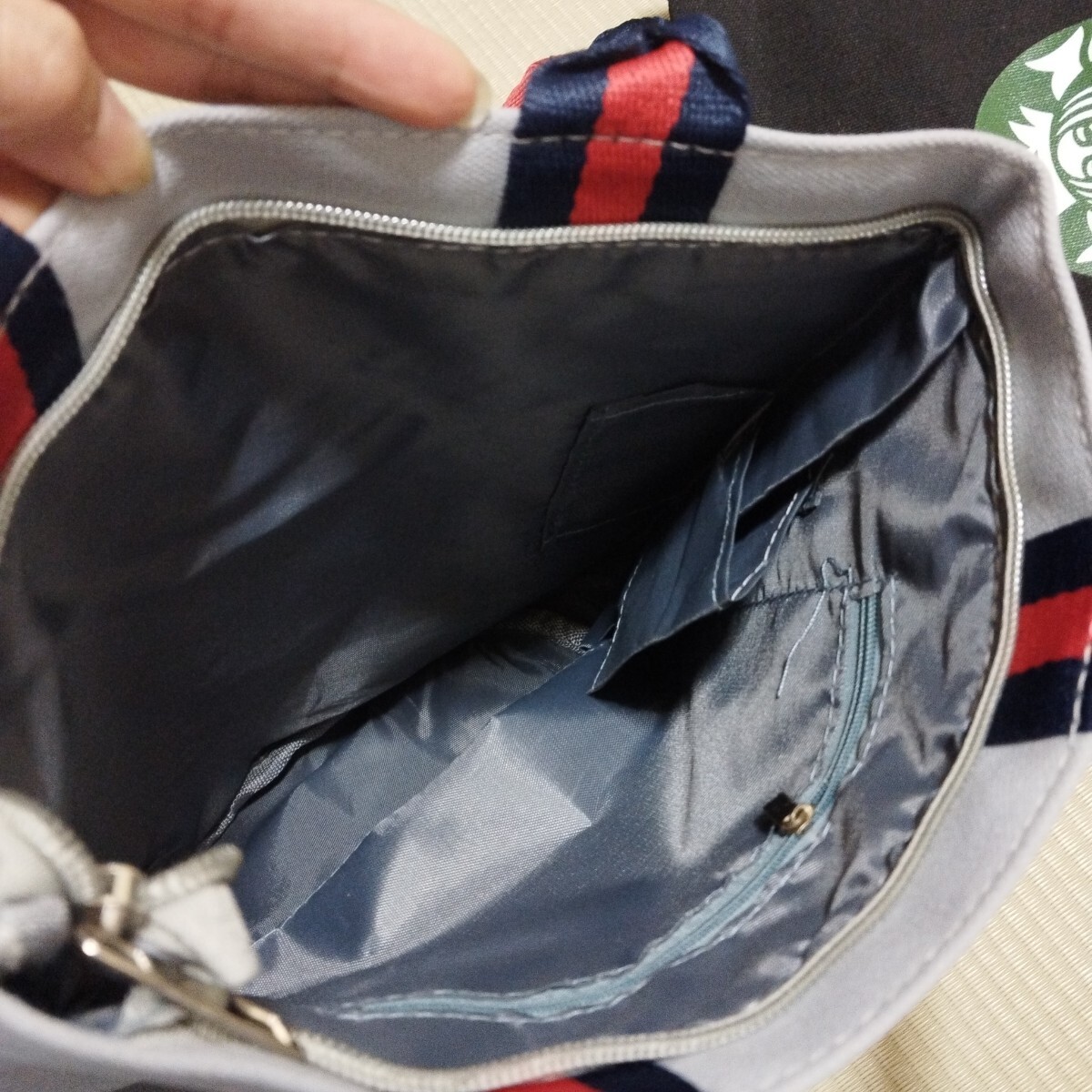 チャック開閉、裏地付き、中ポケットあり、ペットボトル収納あり、ちょっとしたお出かけにはオシャレ、小ぶりの弁当箱なら余裕で入ります。