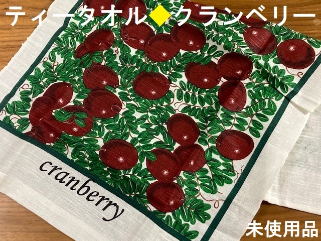 クランベリー柄のティータオル(未使用品)です。ロゴ(画像3枚目)がありますが、どちらの品かわかりません。品質表示はありませんが、感触からリネンかと思います。