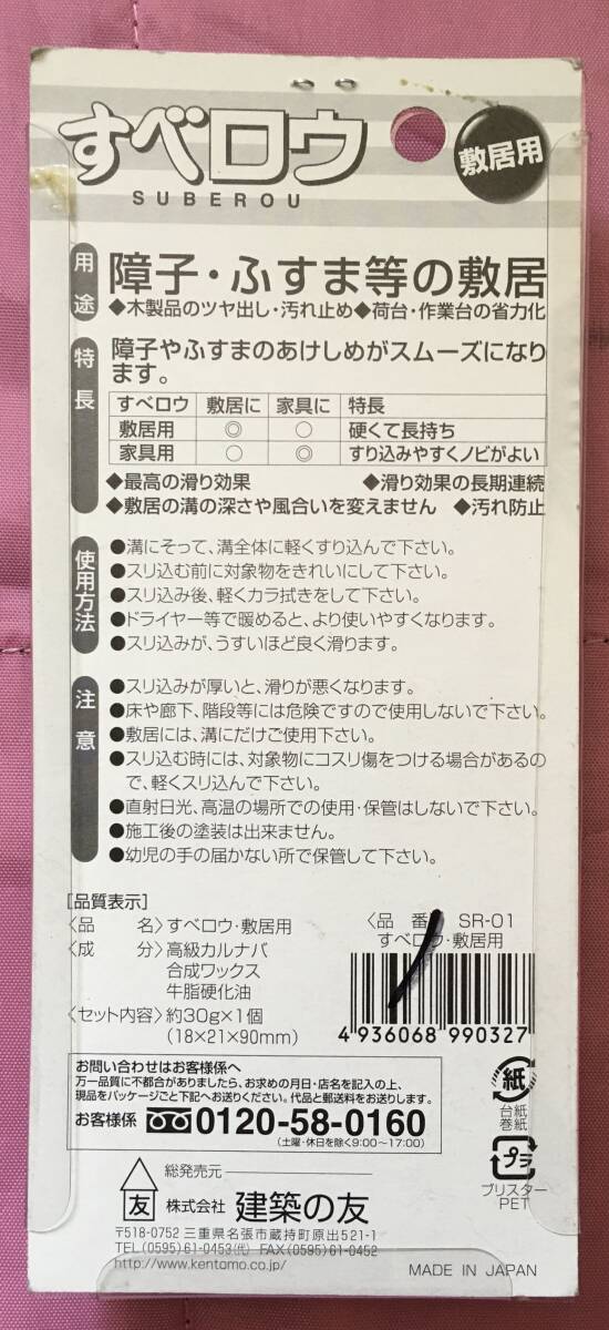 ■画像通りの、建築の友 すべロウ 敷居用 障子・ふすま等の敷居 高級カルナバ配合 汚れ防止 SR-01です。