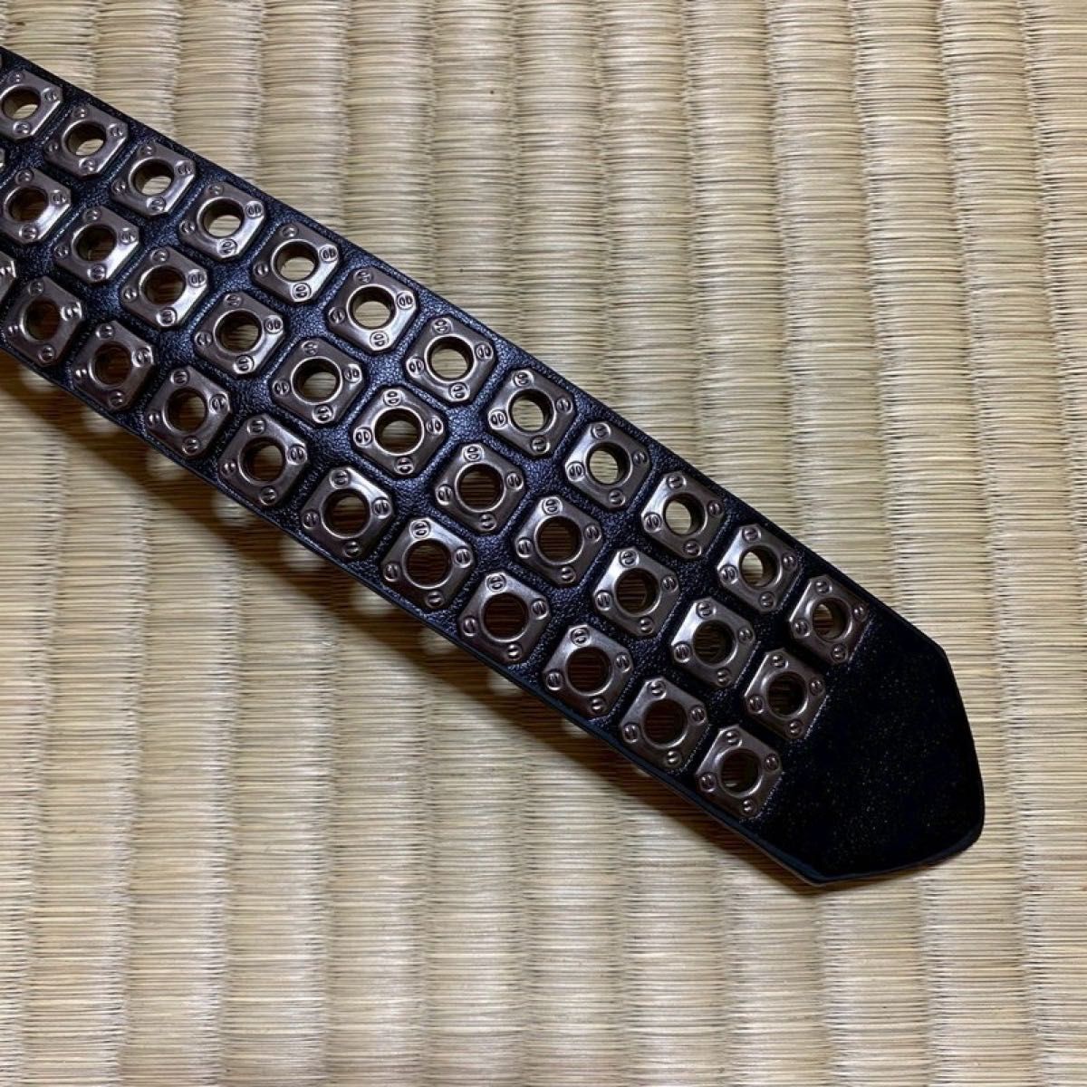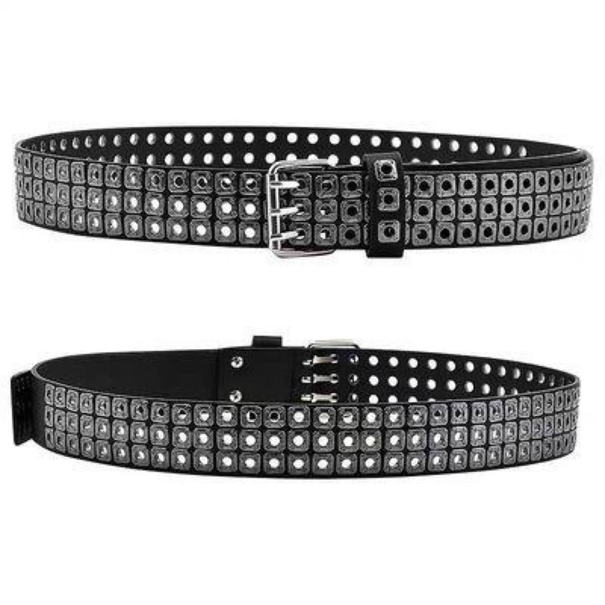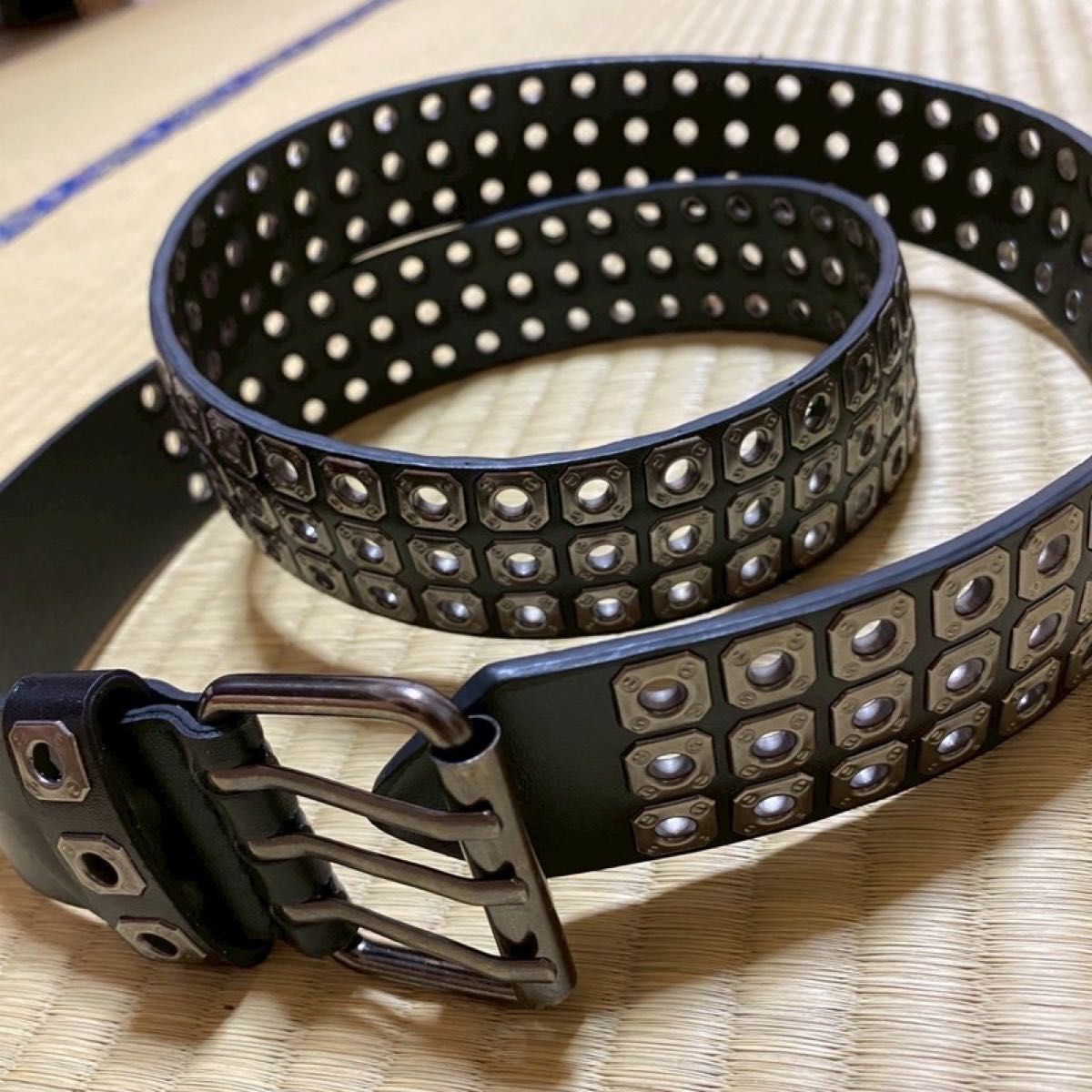 "3連ホールのスタッズが映える、レザー調ブラックベルトです。