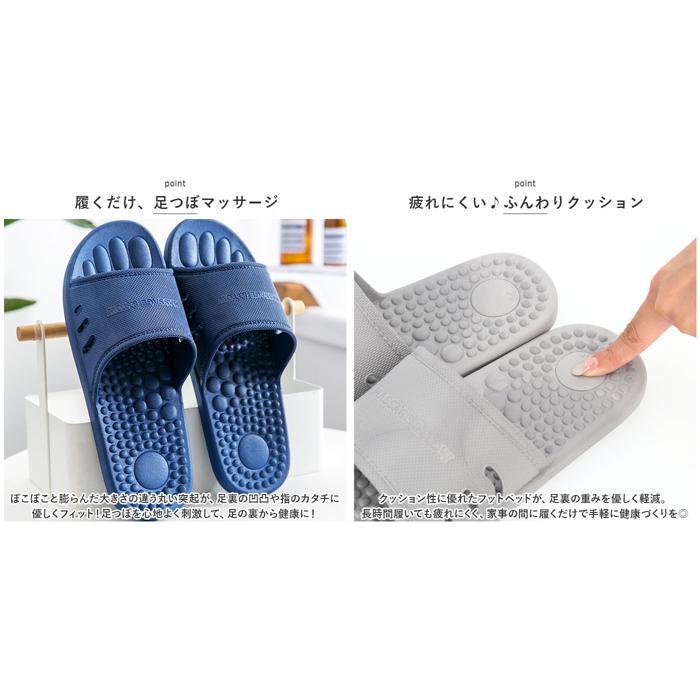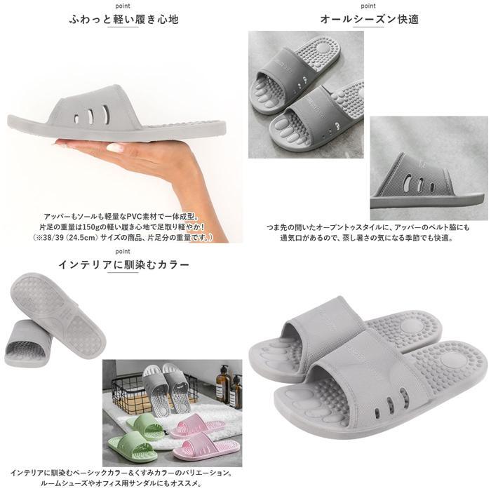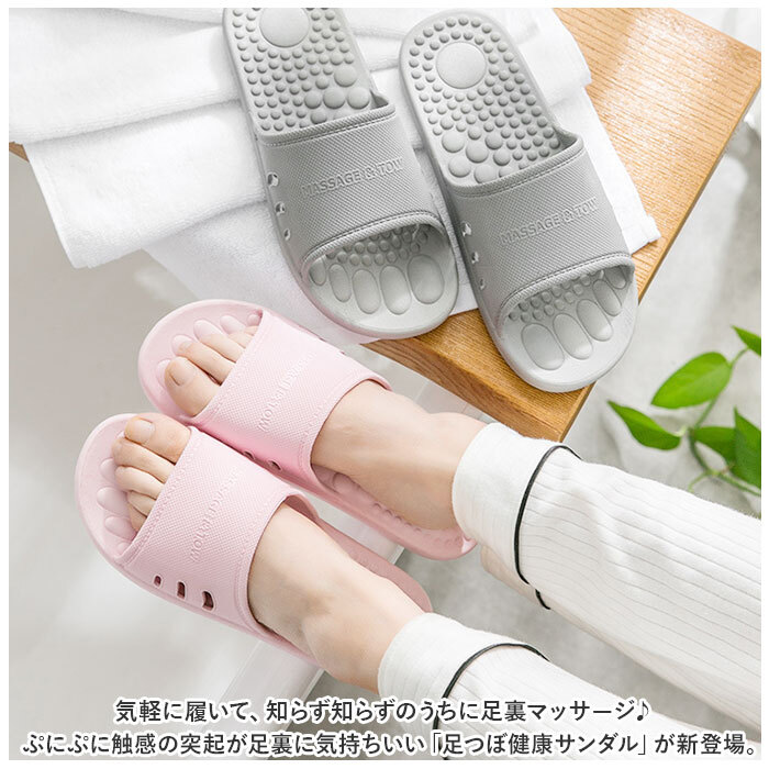 | 商品説明 | ・・気軽に履いて、知らず知らずのうちに足裏マッサージ♪ぷにぷに触感の突起が足裏に気持ちいい「足つぼ健康サンダル」が新登場。 ・【履くだけ、足つぼマッサージ】 ・ぽこぽこと膨らんだ大きさの違う丸い突起が、足裏の凹凸や指のカタチに優しくフィット!足つぼを心地よく刺激して、足の裏から健康に! ・【疲れにくい♪ふんわりクッション】 ・クッション性に優れたフットベッドが、足裏の重みを優しく軽減。長時間履いても疲れにくく、家事の間に履くだけで手軽に健康づくりをスタート。 ・【ふわっと軽い履き心地】 ・アッパーもソールも軽量なPVC素材で一体成型。片足の重量は150gの軽い履き心地で足取り軽やか!(※38/39(24.5cm)サイズの商品、片足分の重量です。) ・【オールシーズン快適】 ・つま先の開いたオープントゥスタイルに、アッパーのベルト脇にも通気口があるので、蒸し暑さの気になる季節でも快適。 ・【水回りでも使える!】 ・市松模様の細かい凹凸が刻まれた滑りにくいアウトソールで、バスサンダルやシャワーサンダルなど、水回りで使用しても安心。 ・【インテリアに馴染むカラー】 ・インテリアに馴染むベーシックカラー&くすみカラーのバリエーション。ルームシューズやオフィス用サンダルにもオススメ。 |