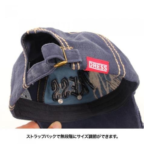 【商品概要】グランジ感あふれる! DRESSガールデザインデニムキャップ!!正面のフェイスにはDRESSガールがプリントされたダメージファブリックのワッペンと、刺繍で「DRESS」とスタッズを配置。サイドにもオリジナルデザインのロゴが刺繍で施されています。バイザーにはダメージ加工&刺繍で「HOOKED ON DRESS」がデザインされるなど、細部に至るまで贅沢に仕上げたALL特別製キャップです。背面のストラップで無段階(58cm~60cm)にサイズ調節ができます ●カラー:ブラック