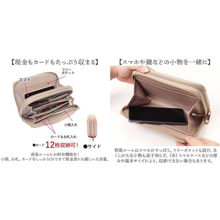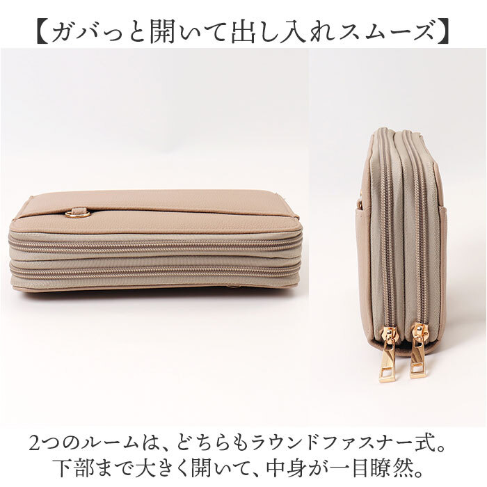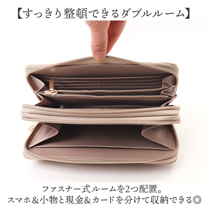 商品説明 | ・・【これ1つで身軽にお出かけ♪】 ・スマホと現金などの貴重品がひとまとめ。仕分けしやすい「ダブルファスナー財布ショルダー」。 ・【すっきり整頓できるダブルルーム】 ・ファスナー式ルームを2つ配置。スマホ&小物と現金&カードを分けて収納できる◎ ・【ガバっと開いて出し入れスムーズ】 ・・2つのルームは、どちらもラウンドファスナー式。下部まで大きく開いて、中身が一目瞭然。 ・【現金もカードもたっぷり収まる】 ・前面ルームにお財布機能を!小銭、お札、カードをしっかりINできて現金派にも嬉しい大容量。 ・【スマホや鍵などの小物を一緒に】 ・背面ルームはスマホがすっぽり。フリーポケットも設け、なくしがちな小物も迷子知らず。 ・(※)スマホケースなどの厚みや端末サイズにより、収納できない場合もあります。 ・【使用頻度の高いカードもラクラク】 ・外側両面にもポケット付き。ICカードや乗車券などもすぐ手に取れて、改札をスムーズに通過。 ・【両手が空いてストレスフリー】 ・長さ調節可能なショルダーを取り付けて、肩掛けや斜め掛け。アクティブシーンでも快適。 ・【大人女子にぴったりなデザイン】 ・落ち着いた上品な印象で、コーデを選ばない♪質感の異なるデザインをラインナップ。 ・【ポケット仕様】 ・前面ルーム:ファスナー式小銭入れ×1、フリーポケット×4、カードポケット×12 ・背面ルーム:フリーポケット×2 ・外側:フリーポケット×2 |