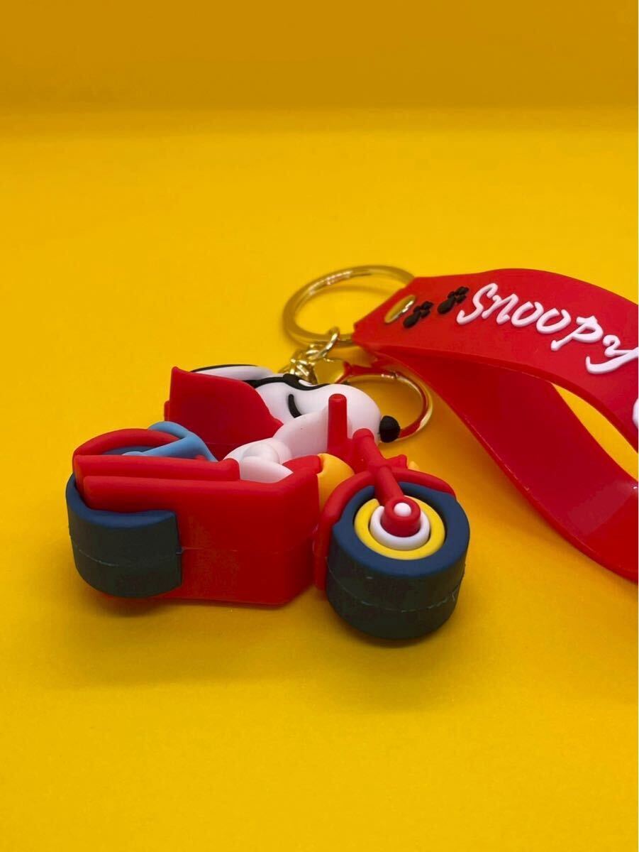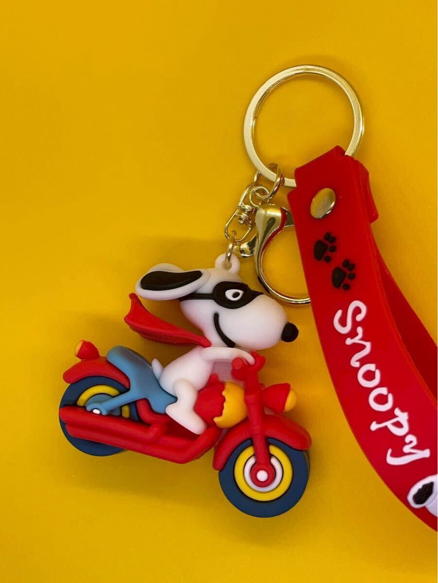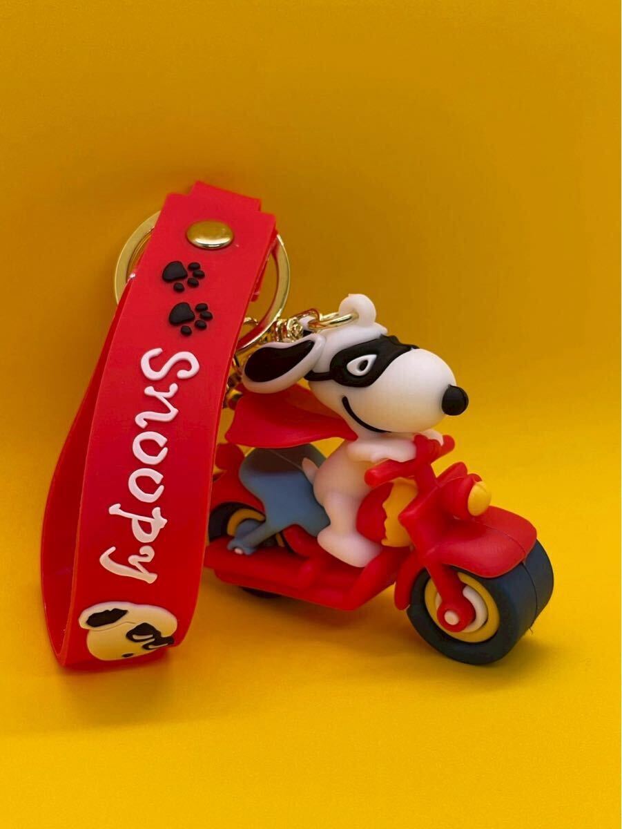 バイクに乗ったスヌーピーのシリコンキーホルダー、レッドストラップ付きで可愛らしいデザイン。
