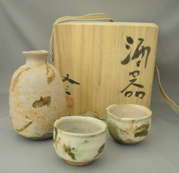 陶芸家、唐木田又三氏の徳利と大きめの酒盃の3点セットでございます。共箱です。