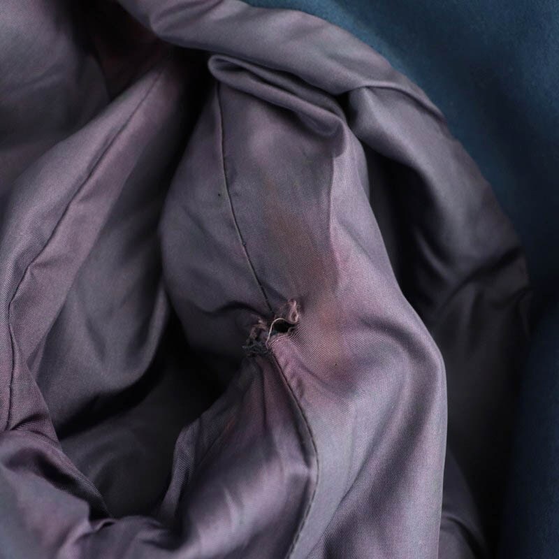【状態】表裏に複数の虫食い穴、裏地に変色、及びブランドタグに黄ばみ汚れがございます。 ※全体的に中古品としての使用感と上記のようなダメージがありますが、通常使用には支障のない商品です。掲載写真や記載内容をご確認いただき、ご理解の上ご購入ください。