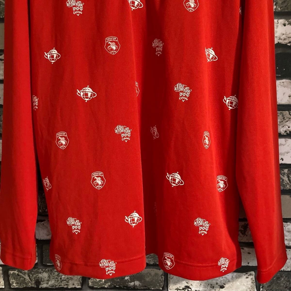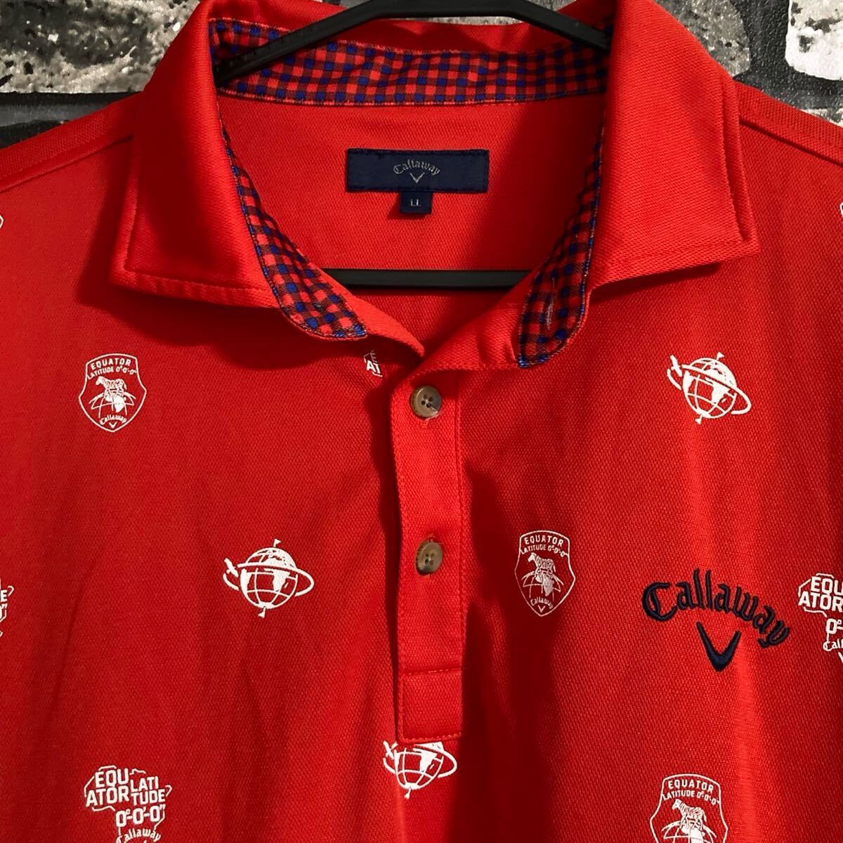赤色の総柄長袖ポロシャツ、Callawayロゴ入り。