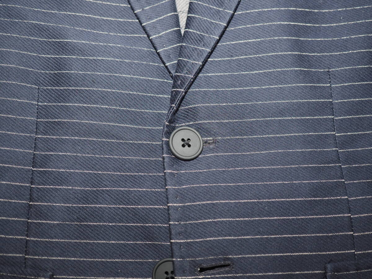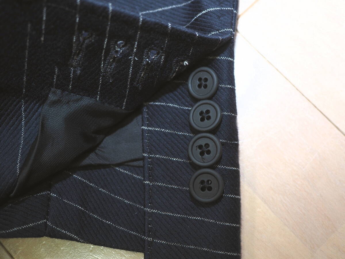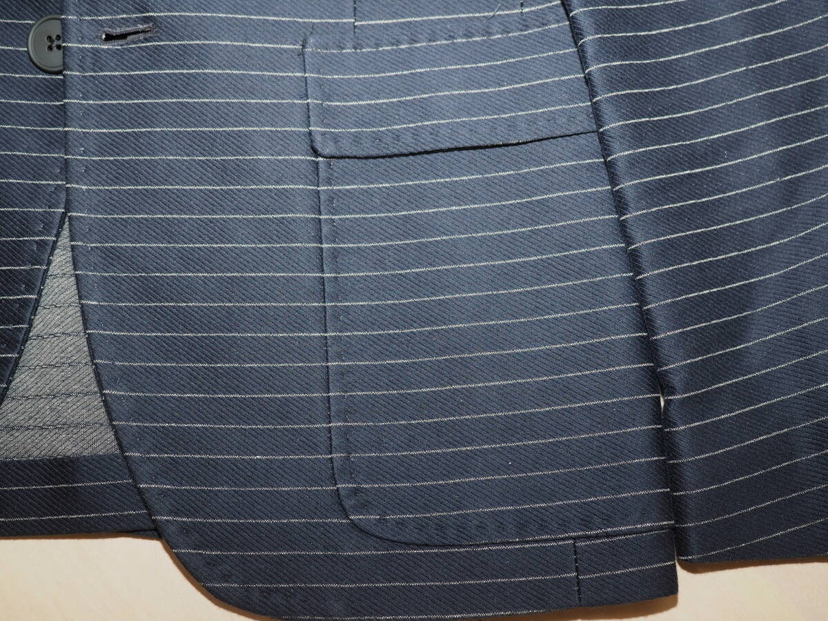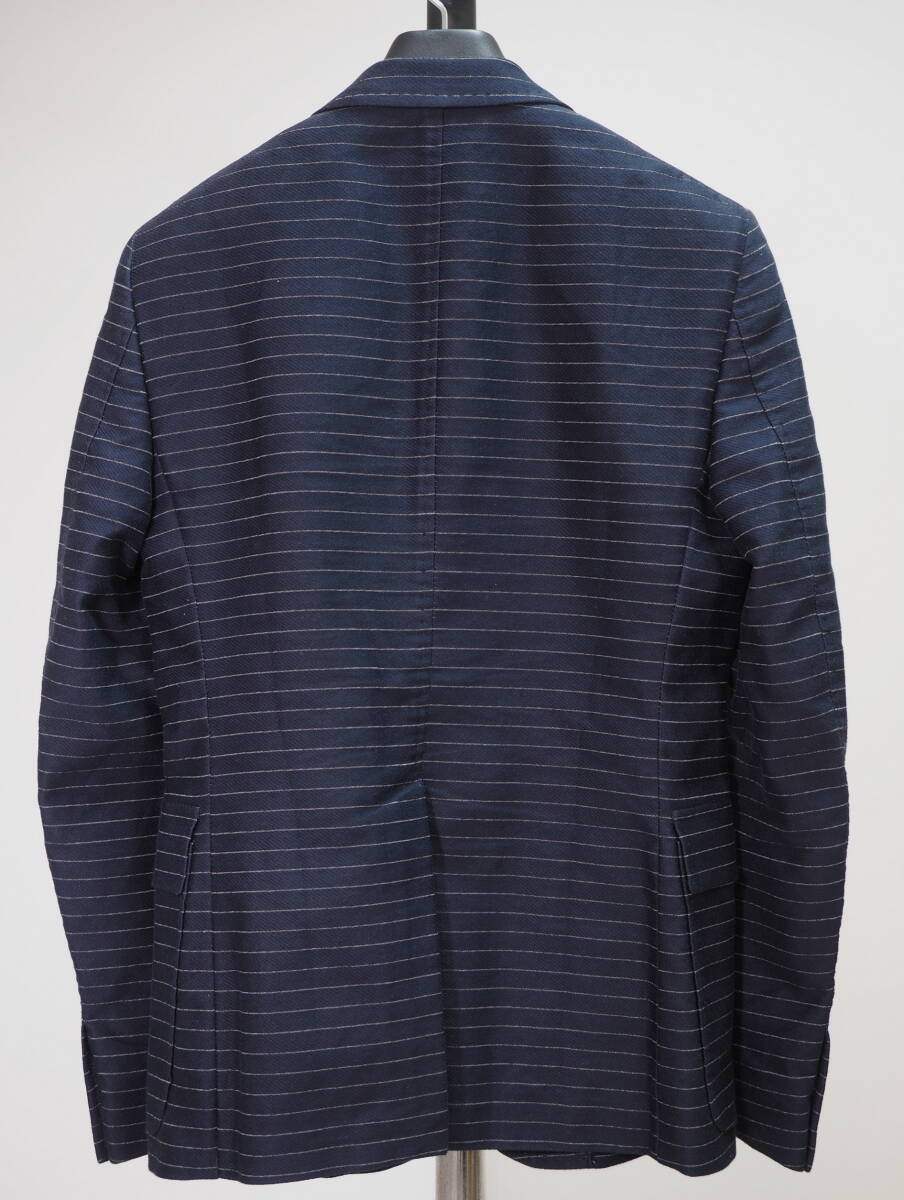 春夏もののコットンリネン素材のボーダー柄のジャケットです。フロントは2つボタンで裏地は背抜き、センターベント、袖は本切羽のつくりです。