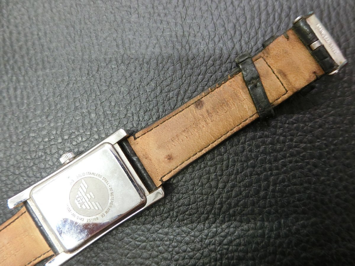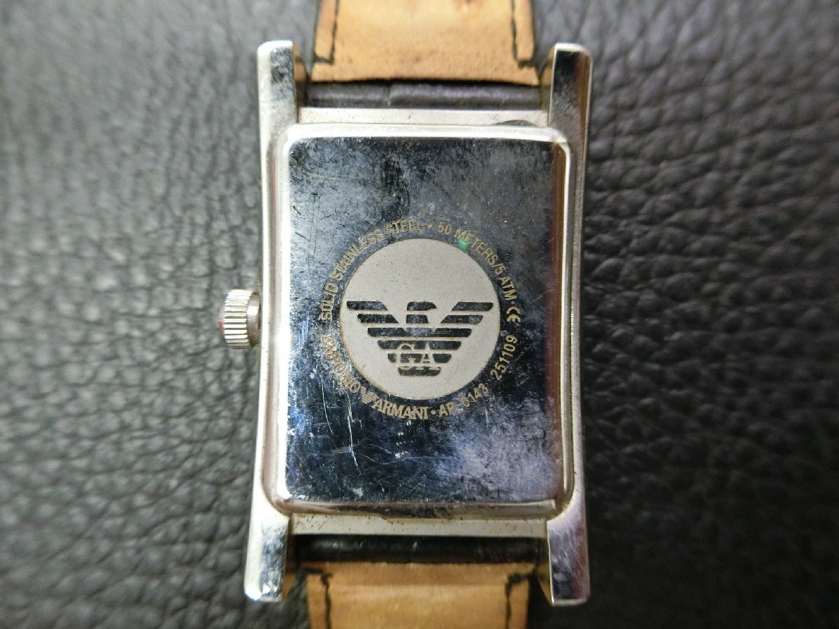 | 商品説明・コメント | エンポリオ アルマーニ EMPORIO ARMANIの腕時計です。 型番はAR-0143となります。 駆動方式はクォーツになりますが現在では動いておりません。 しかしながら電池交換をして動く保証は出来ません。 サイズは竜頭含まずの横幅が30.5mm、ラグからラグ迄の縦の幅が47.5mm、厚みが10.45mm程度で御座います。 素人計測になりますので御参考迄にして下さい。 今となっては先ず手に入りませんし中々市場に出回る事が有りません。 状態は年式相応では御座いますがベースとしてや部品取り等に使って頂いても良いでしょうし年式相応でそのまま使っても良いかもしれません。 当時物のビンテージに理解の有る方にお勧め致します。 あくまでも部品取りやオーバーホール前提として下さい。 商品の適合や仕様の詳しくは御自身でお調べ頂きます様にお願い致します。 古い物になりますので経年の修理で非オリジナルの部品が使われている事も御座いますので全てに於いてオリジナルを保証する物では御座いません。 写真では御確認頂けない不具合等もある前提で原則ジャンク扱いにて御考慮下さい。 上記の通り、原則瑕疵担保責任はお受け致しませんので御了承下さいます様御願い致します。 上記の条件を御理解頂けない方の入札はお断り致します。 商品状態 | E | 注意事項 | ■ご質問がありましたらQ&A若しくはメール迄宜しくお願い致します。 | ■原則、中古ジャンク扱いの認識を頂ける方・極端に神経質で無い方・身勝手で無い方での御入札お願い致します。 ■例外なく汚れ、割れ、劣化、社外品による補修、油脂類切れ、折れ、腐食、破損、欠損、欠品、色褪せ、錆、機能的な欠陥は有るだろう前提でジャンク扱いでオーバーホールベースのノークレーム、ノーリターンでの取引条件とさせて頂きます。 ■入札の際は、商品説明・内容・写真を良く御確認の上、自己責任に於いて御入札下さい。 ■画像の色は写真の撮影状況により現物と異なる場合が御在います。 その旨を了承戴ける方のみの御入札をお待ち致します。 ■オークション終了から3日以内の御連絡頂けない場合は落札者都合にてキャンセルとさせて頂きます。 その際、yahooより自動的に『非常に悪い』の評価が付きますので御了承下さいませ。 ■商品の発送は入金確認後、4~7日のお時間を頂きます。 ■オークション終了から1週間以内の御入金でお願い致します。 ■新規のID方の悪戯入札防止の為、評価の無い新規の方・評価に著しく不安が在る方の御入札はお断り致します。 新規IDの方でどうしても入札したい方は質問欄より購入の意思を示して頂いた上で御入札下さい。 購入の意思を示さず入札頂きました場合は入札取り消しをさせて頂き今後、弊社商品への閲覧・入札は御断り致します。 ■Seller will not ship internationally. |