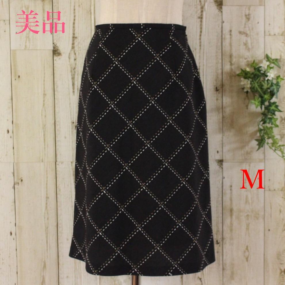 美品★チェック柄刺繍ミディアム台形スカ-ト Mサイズ レディース古着 大人可愛い上品 通勤通学 おしゃれ 膝丈 オシャレ