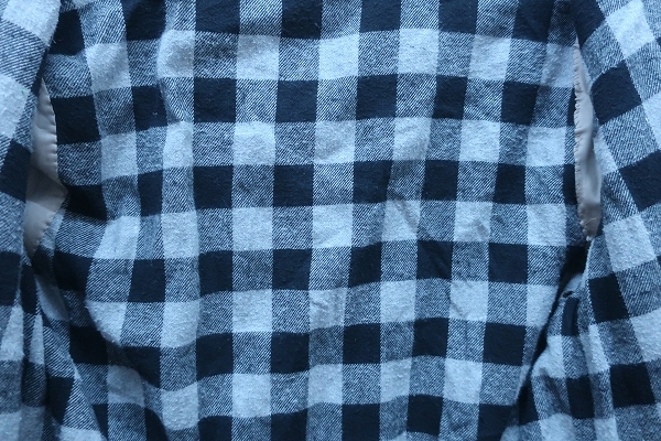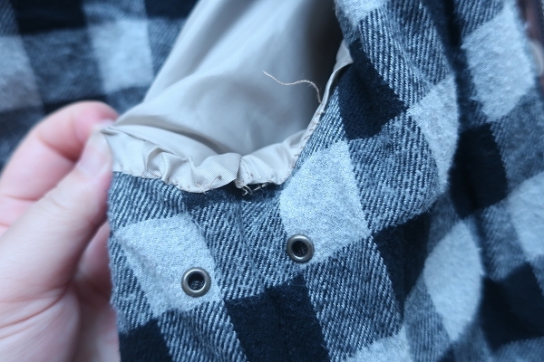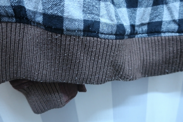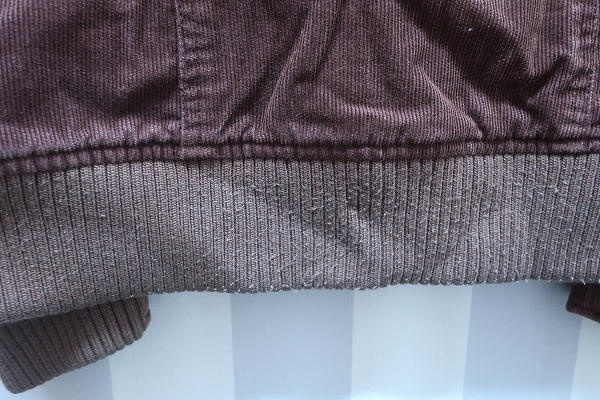 リブに毛羽立ちと毛玉の付着、内側の左脇のステッチに解れ、