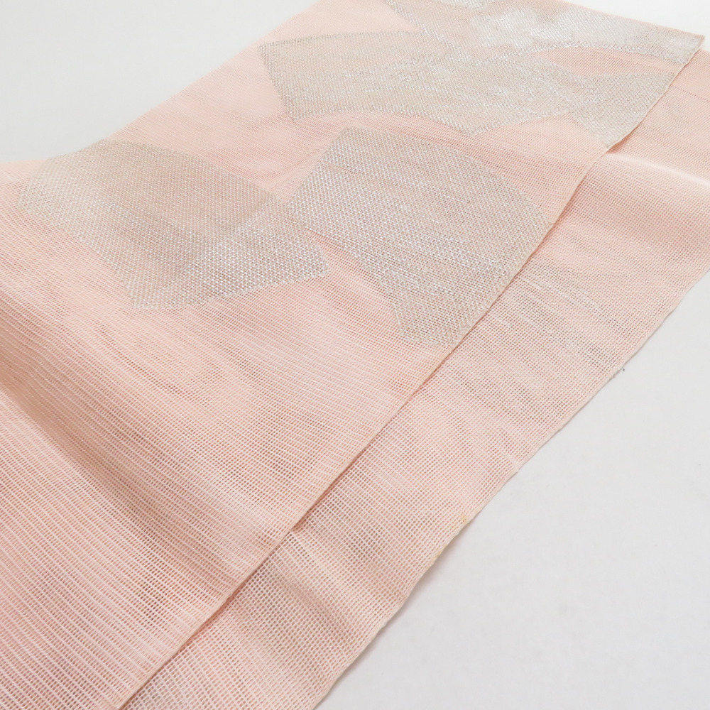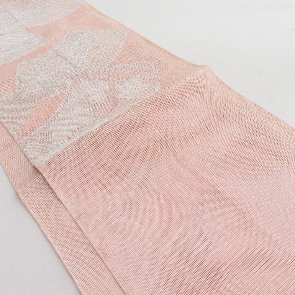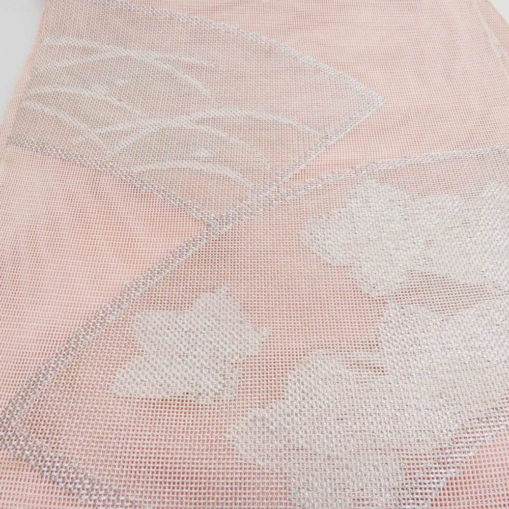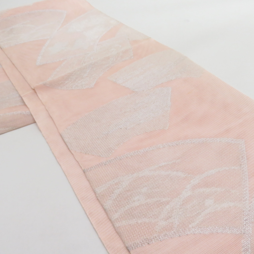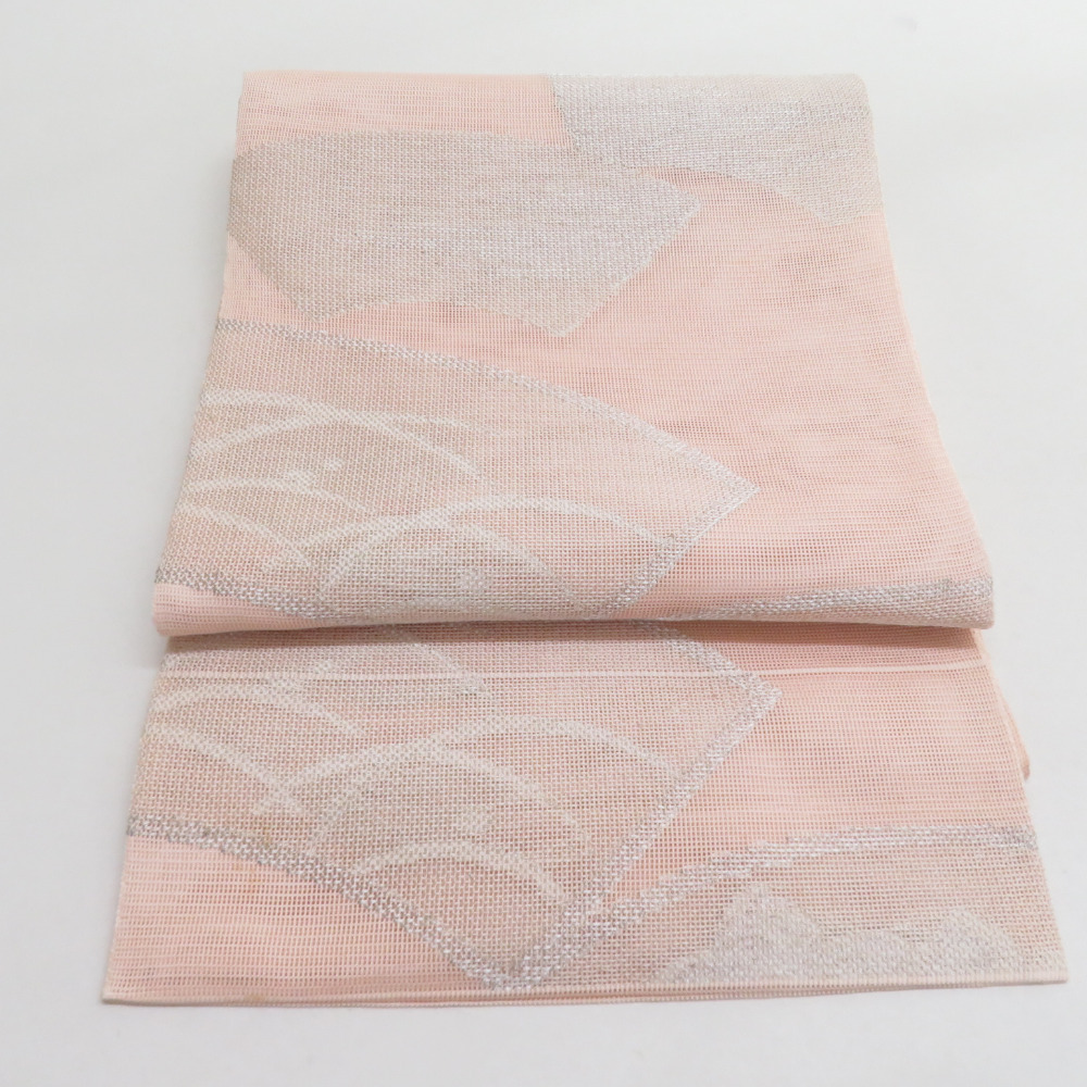 | 袋帯 夏用 扇面柄 桃色 銀糸 六通柄 正絹 芯なし仕立て なし 着物帯 長さ432cm |