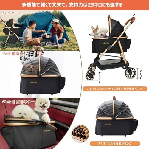 •   分離折りたたみ式&スタイリッシュな犬用 カート:犬 バギーはゴールドフレームとアルミニウム合金製のゆりかごから構成されています。折りたたむときはゆりかごを取り外してください。ゆりかごは車載犬小屋として使用でき、シートベルト2本とシートベルトバックル2本が付いています。ゆりかごハンドルの両側はボタンレス設計(指を挟みうリスク低減)で、柔軟に調節でき、短距離使用中に発生する軽い揺れは安全範囲に属し、長距離移動時にゆりかごとフレームを組み合わせてから使用することをおすすめします