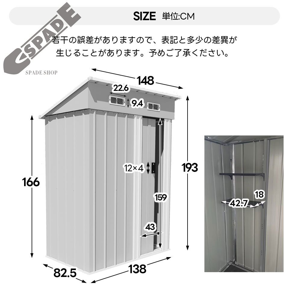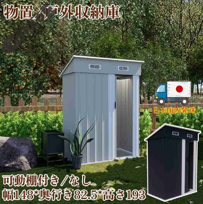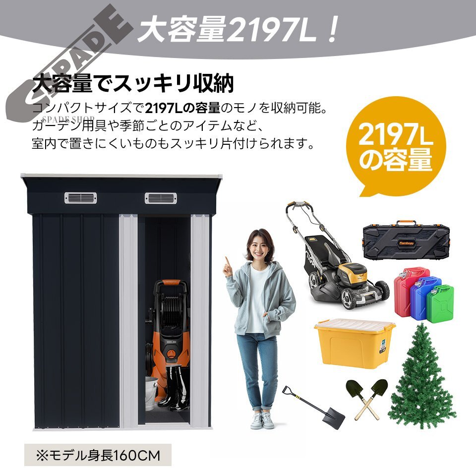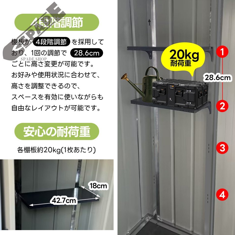 ◆01大容量でスッキリ収納 コンパクトサイズで2197Lの容量のモノを収納可能。 ガーデン用具や季節ごとのアイテムなど、室内で置きにくいものもスッキリ片付けられます。 ◆02扉の開閉が邪魔にならない!引き戸タイプ 扉を開けるためのスペースは不要で、狭い場所でもスムーズにアクセスできます。 大きく開けられるため、荷物の出し入れが簡単です! ◆03床材補強フレーム付き! スチール補強フレーム付きで、安全性・耐久性を向上させました! ※床材は付属しておりません。お客様にてご準備をお願いいたします。 ◆04 4段階調節 棚板が4段階調節を採用しており、1回の調節で28.6cmごとに高さ変更が可能です。 お好みや使用状況に合わせて、高さを調整できるので、スペースを有効に使いながらも自由なレイアウトが可能です。 安心の耐荷重 各棚板約20kg(1枚あたり) ◆05しっかりとした頑丈な素材 ハイテンション亜鉛メッキ鋼板採用! 有害物質が発生しない環境に配慮した粉体塗装仕上げで、衝撃に強くサビにくい特徴があります。 外部には特別な防水加工が施され、製品全体が防水・防錆効果が優れています。 ◆06衝撃に強く凹凸壁面 壁面には特有の凹凸形状が採用されています。 通常商品の平滑な壁面と比較して、凹凸部分が外部からの衝撃や圧力を分散し、全体的により安定感が増しています。 ◆07排水に役立つ屋根 屋根は本体よりも広く、斜面が設けられています。 雨が降ると、屋根にたまることなく、斜面と凹槽を経由して地面に流れ落ちます。これにより、物置内に雨が侵入する心配がなく、内部の部品をより良く保護します。 ご注意:完全な防水仕様ではありませんので、事前に防水処理を行うことをお勧めします。 ◆08空気を循環させて、室内の温度と湿度を快適に保ちます。 ◆09屋根の耐荷重について 屋根の耐荷重は一般的に1平方メートルあたり30kg程度です。 通常の積雪には耐えられますが、積雪が多い場合は早めに雪かきを行ってください。積雪や台風などの自然災害による損害については、保証できませんのでご了承ください。積雪地域や台風の影響を受けやすい地域では、必要に応じて屋根の補強をお勧めします。 補強キットは当店では取り扱っておりませんので、お近くのホームセンターなどで補強材をご購入ください。 ◆10その他の安心対策 #1.プラスチック屋根カバー 収納庫の屋根を補強できます。 #2.取っ手付き 取っ手付きで、開け閉めがスムーズに行えるため、収納物へのアクセスも簡単です。 #3.手袋付き 作業用の手袋をご用意しております。