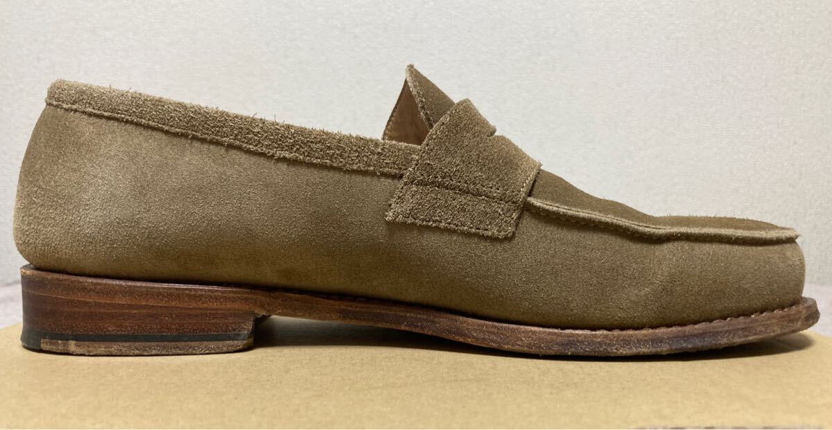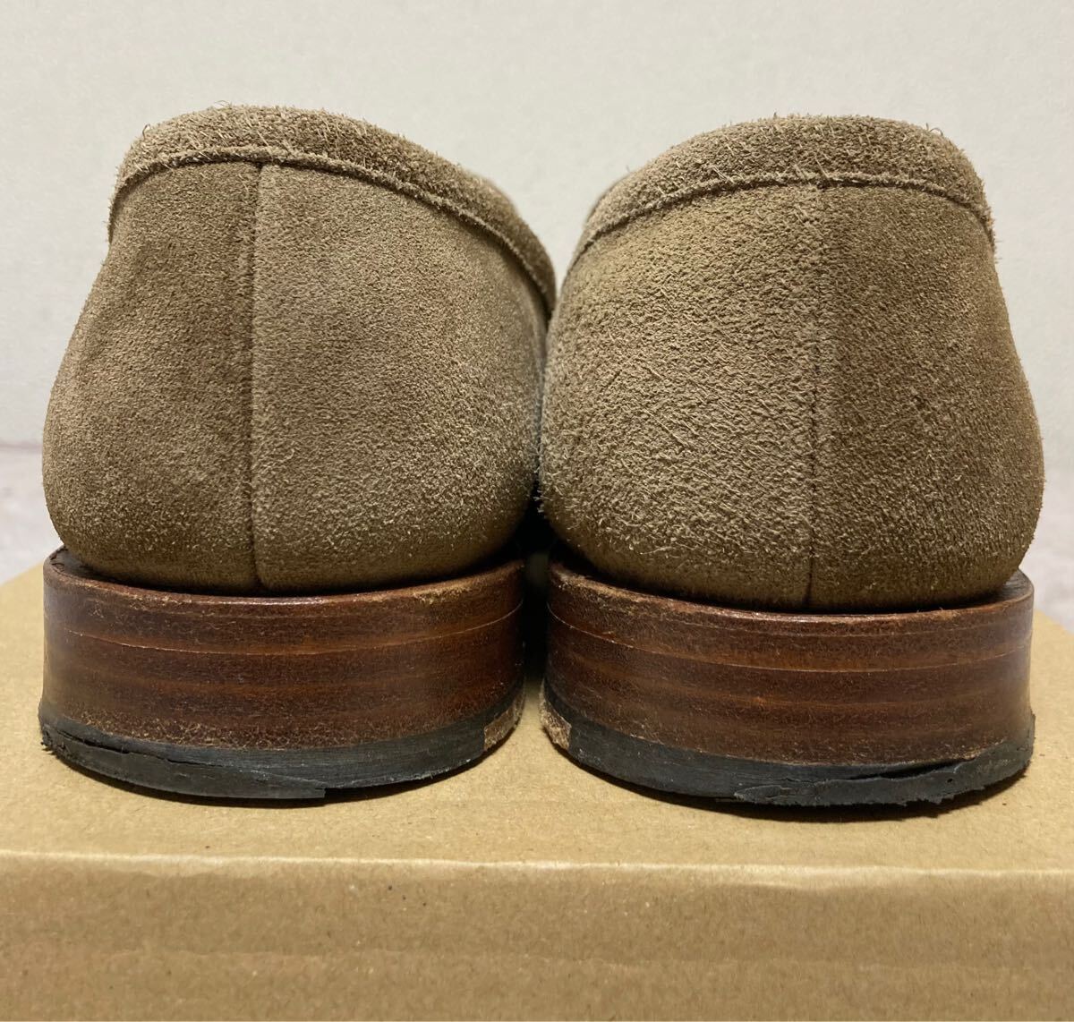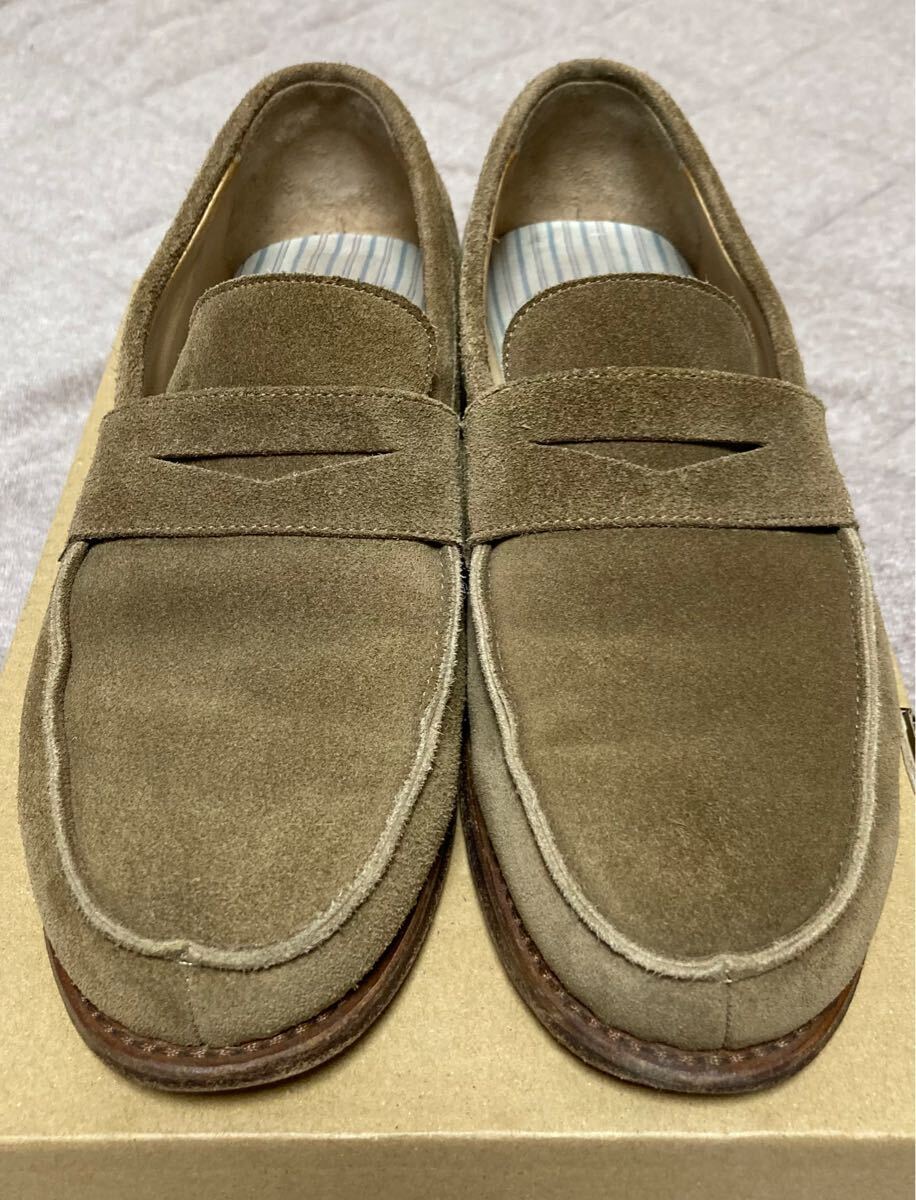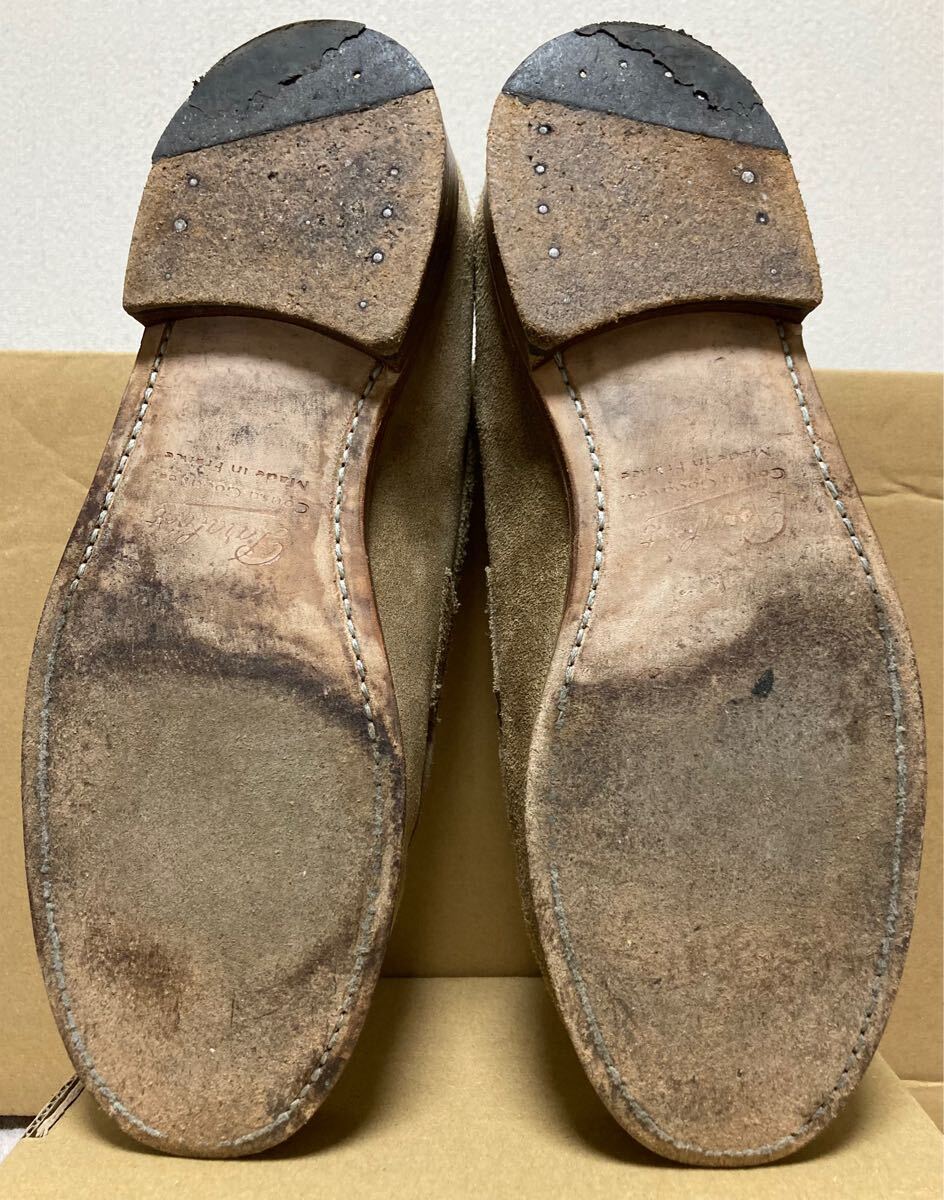サイズはUK6.5(25.0cm相当)、アッパーはグリーンのスエード、アウトソールはレザーソールです。