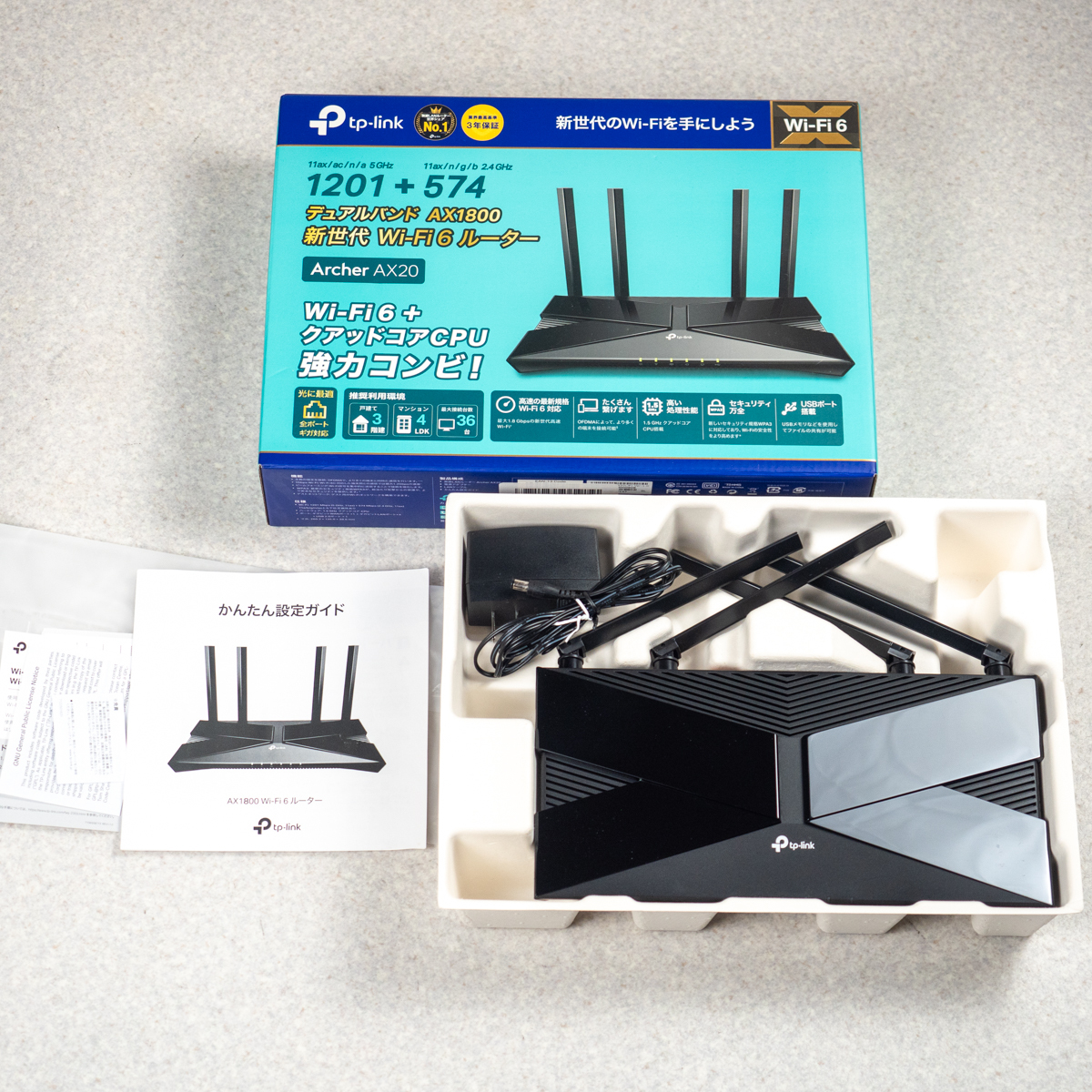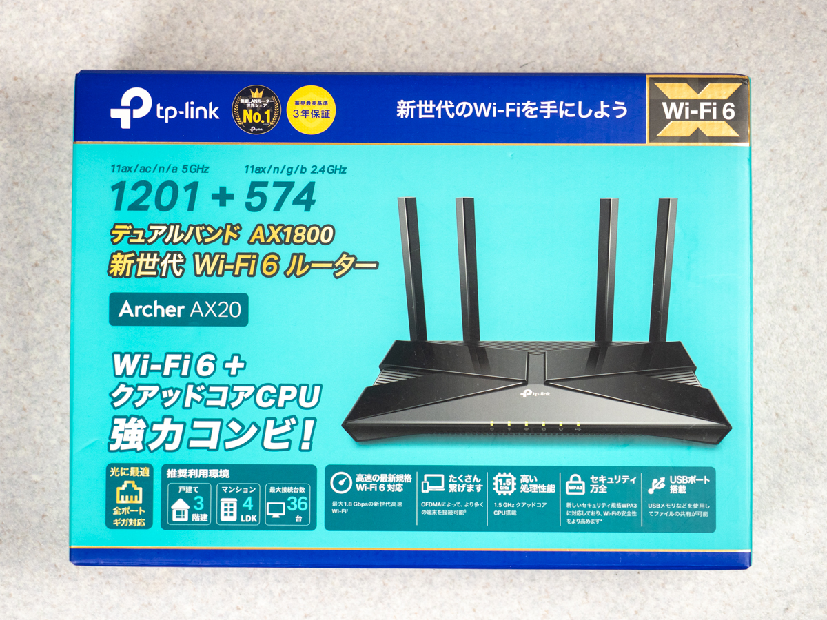 こちらは「 TP-Link WiFi ルーター WiFi6 PS5 対応 無線LAN 11ax AX1800 1201Mbps (5 GHz) + 574 Mbps (2.4GHz) 1.5Ghz クアッド・コアCPU搭載 OneMesh対応 Archer AX20」です。