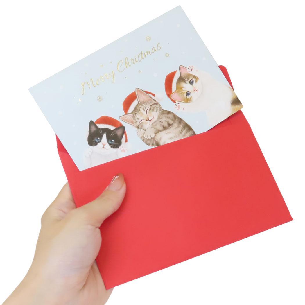 心温まるクリスマスを楽しんじゃおう ねこ好きが集まる[フェリシモ猫部]の可愛らしいクリスマスカード開くとプレゼントを持って喜んでいる猫たちが飛び出す、楽しいしかけ付きPOP UPカードですかわいい封筒付きで贈ることができます。心温まるクリスマスを楽しんじゃおう封筒サイズ:約165x115mm(定形内)