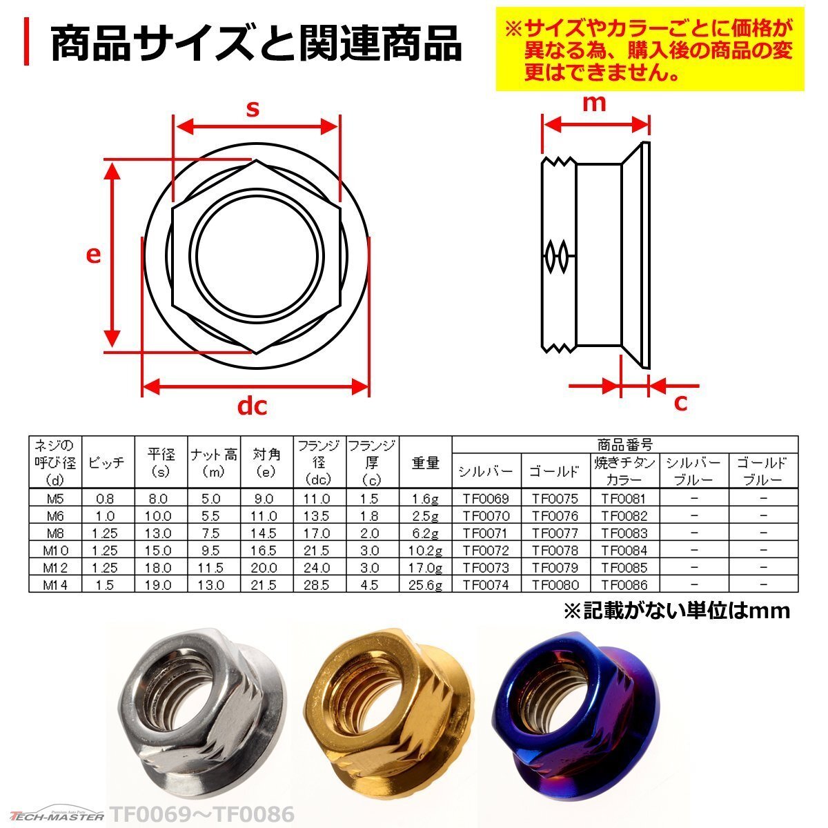 | フランジナット サイドカットデザインタイプ(デザイン 六角ナット) 数量:1個売り 材質:SUS304ステンレス ナット形状:フランジナット(サイズは画像に掲載) 商品サイズ:M10 P1.25(詳細は画像に掲載) 適合車種:汎用タイプ。サイズ等でご判断ください。なお、適合車種に関しての回答は致しておりません。 商品カラー:ゴールド ※サイズやカラーごとに価格が異なる為、購入後の商品の変更はできません。 また、ご購入数しかお取引ができません。 数量以上ご必要の場合は、ご入札前にご質問ください。 在庫がございましたら別途出品させていただきます。 |