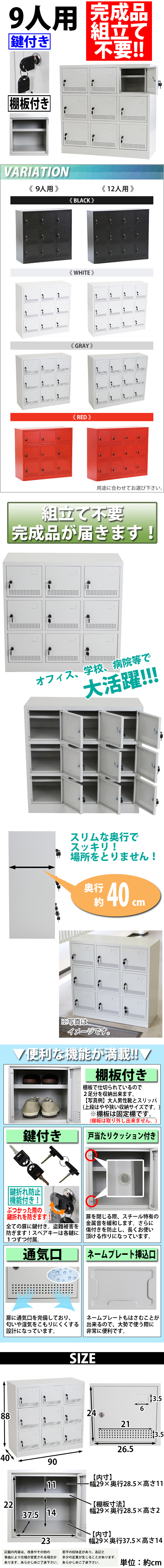 ■本体寸法・・・約W90×約D40×約H88(cm)(鍵は、合計18(内スペアキー9)個付属致しております。) ■梱包寸法・・・約W95×約D45×約H95(cm)/約36kg ■ロッカー ロッカー内寸(上段):約W29×約D28.5×約H11(cm) ロッカー内寸(下段):約W29×約D37.5×約H14(cm) |