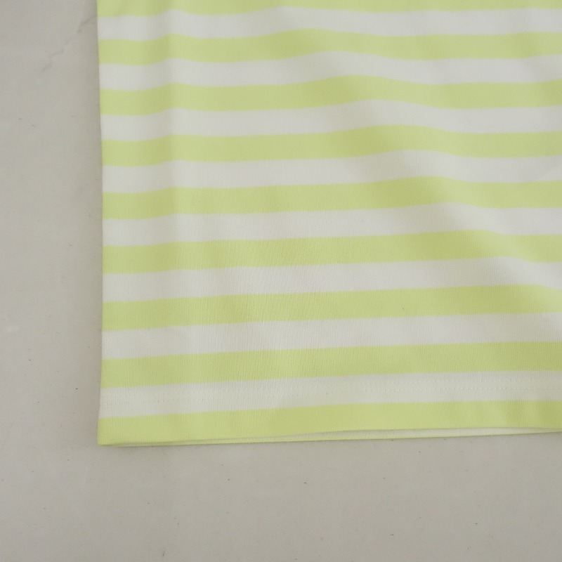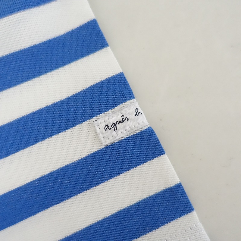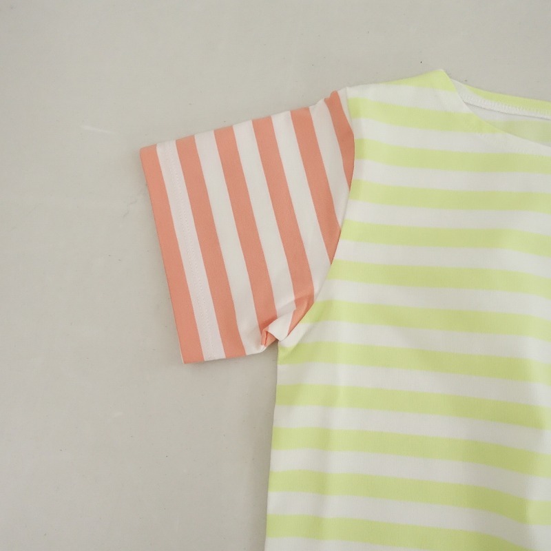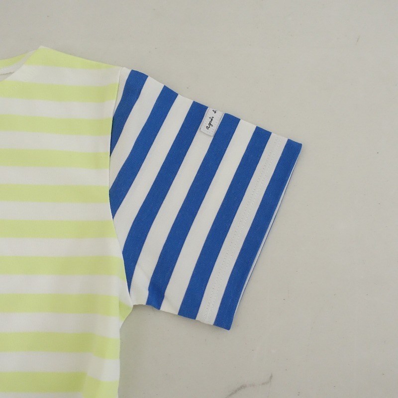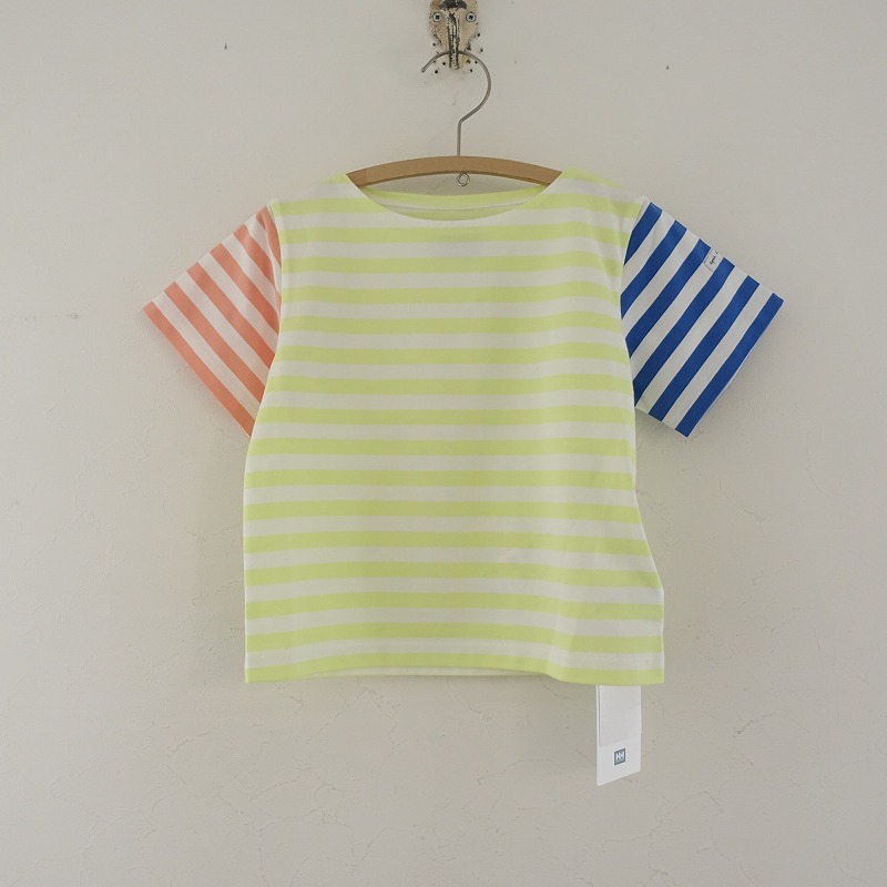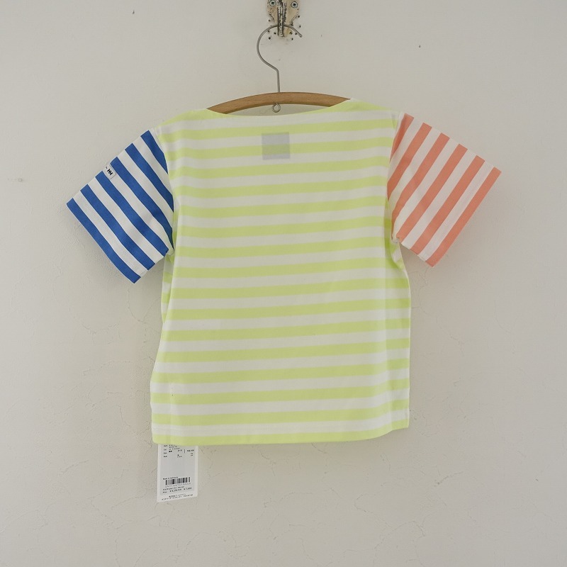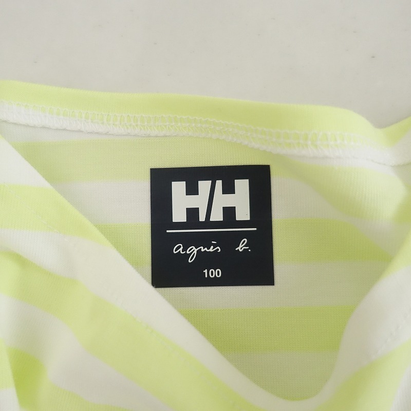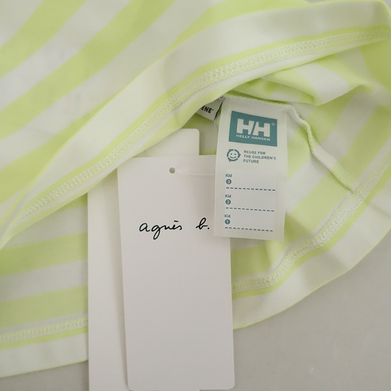| agnes b.×HELLY HANSENのマリンボーダーTシャツです。カラーはホワイト×ライトイエロー、ブルー・サーモンピンクの3種類のボーダー織地で切り替えられております。子供用アイテムです。 |
