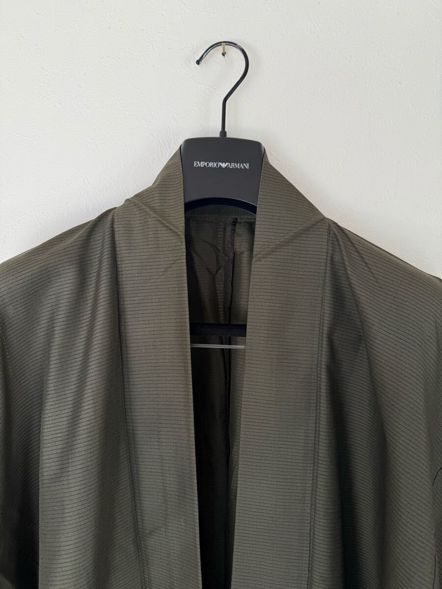 シンプルな無地の羽織(男性用・和装コート)です。落ち着いたカーキグリーン系の細かな縞模様が入った生地で、上品ながら普段使いにも適した一枚。裏地はなく、軽やかに羽織れるタイプです。多少の保管シワはありますが、大きなダメージは見られません。アンティーク・リサイクル着物にご理解のある方におすすめです。