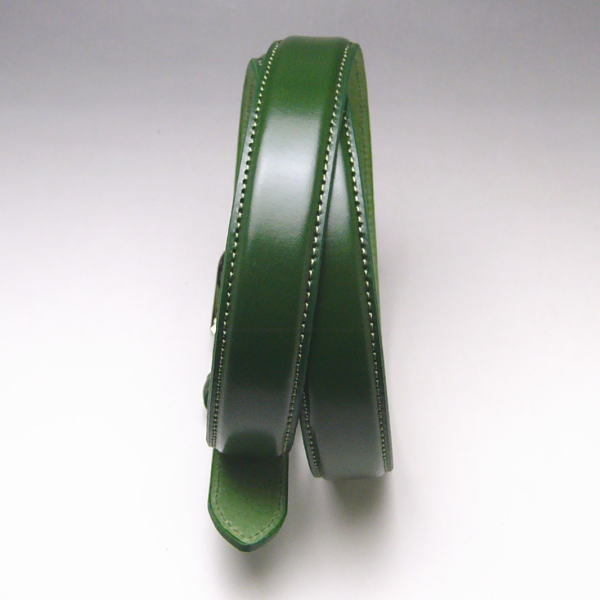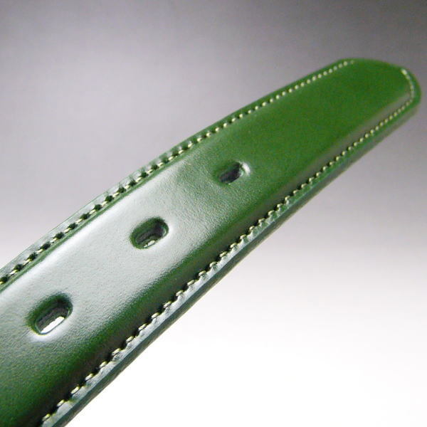 1枚のレザーを銀面と床革に割いて芯材を入れ、両サイドをギュッと大きめなステッチで縫い合わせることで厚みをプラス! 強度が上がるのはもちろんこと、見た目にも立体感がうまれ高級な雰囲気の一本に仕上がっています。
